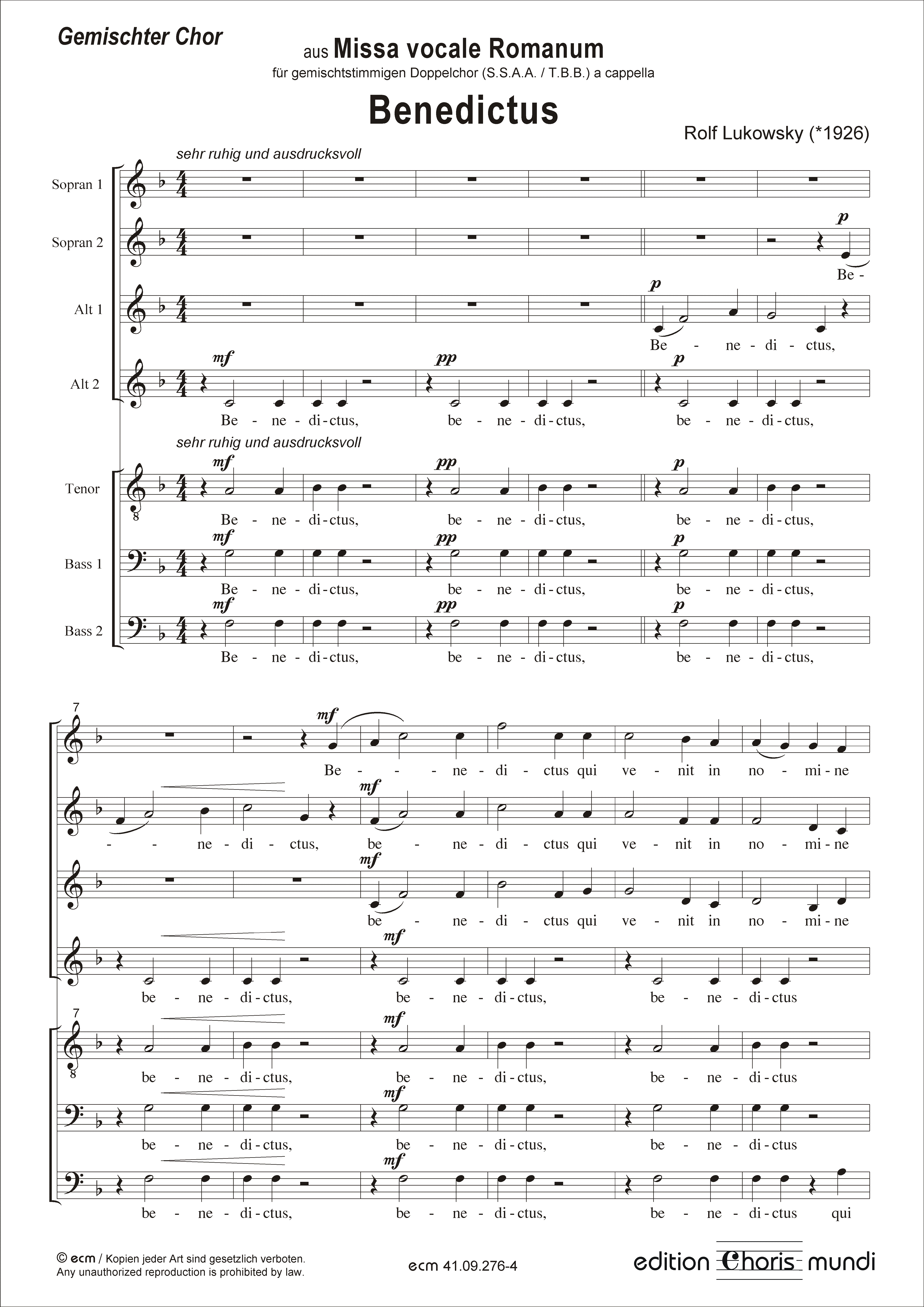 from “Missa vocale Romanum” for mixed double choir S.S.A.A. / T.B.B. Kyrie • Gloria • Sanctus • Benedictus • Agnus Dei scoring: S.S.A.A. / T.B.B. / lyrics: - language: Latin / key: F major / duration: 2:15 min. This opus is also available in a version for female choir.