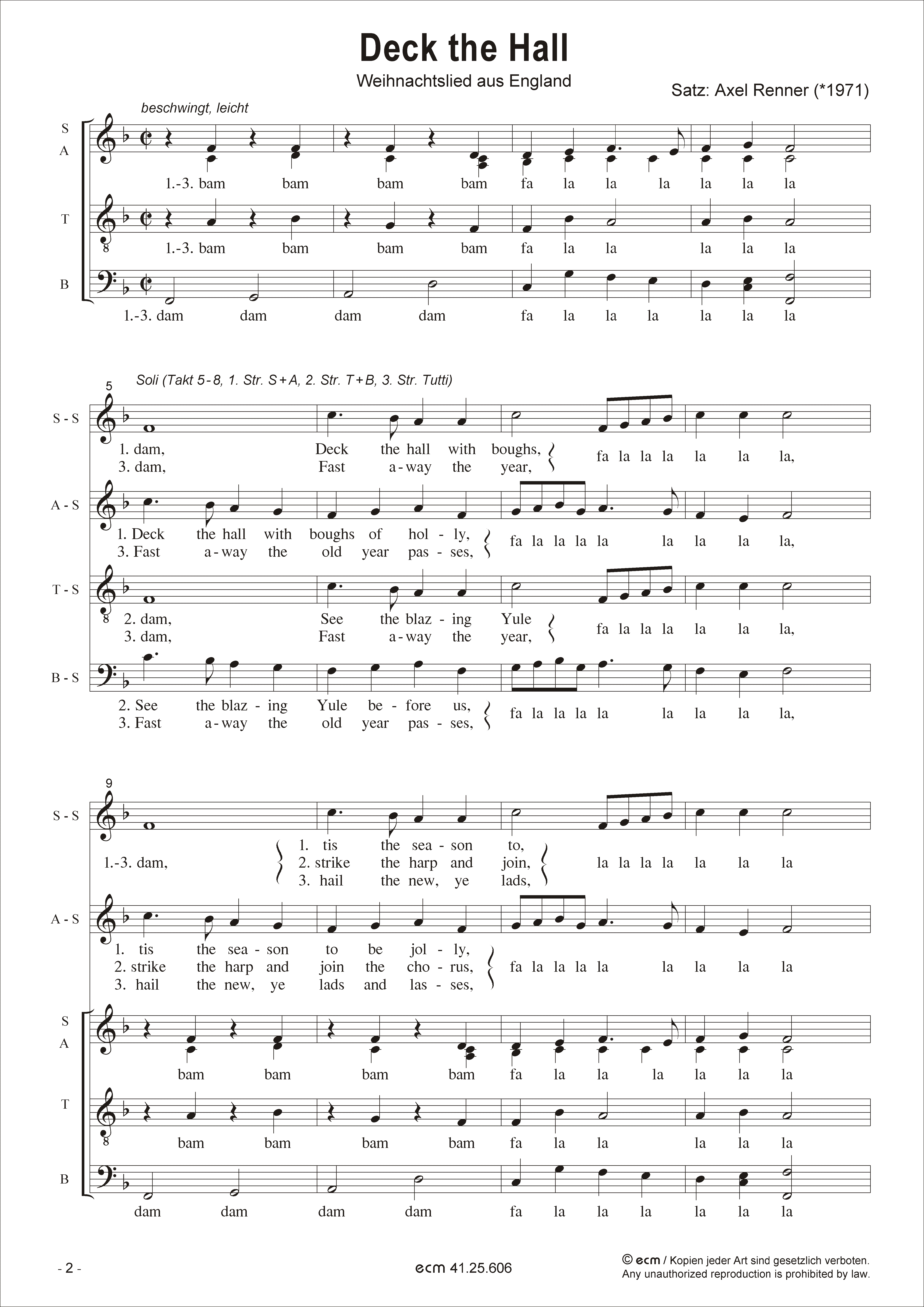 Besetzung: S.A.T.B., Soli (S.A.T.B.) / Text: Enlisches Weihnachtslied Sprache: englisch / Tonart: F-Dur / Dauer: 1:40 Min