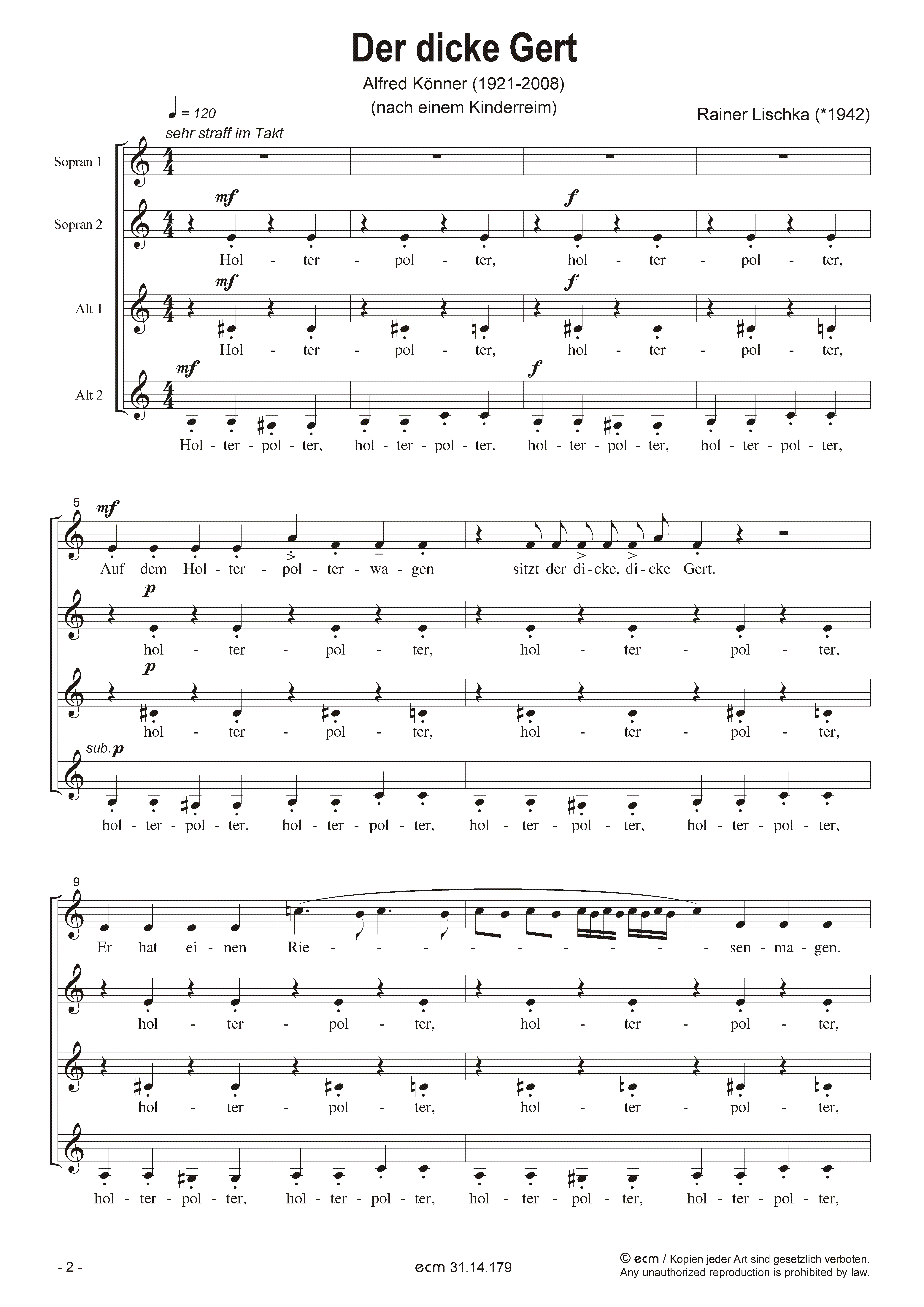 Besetzung: S.S.A.A. Text: Alfred Könner (1921-2008), nach einem Kinderreim Sprache: deutsch / Tonart: gemischt / Dauer: 1:20 Min.