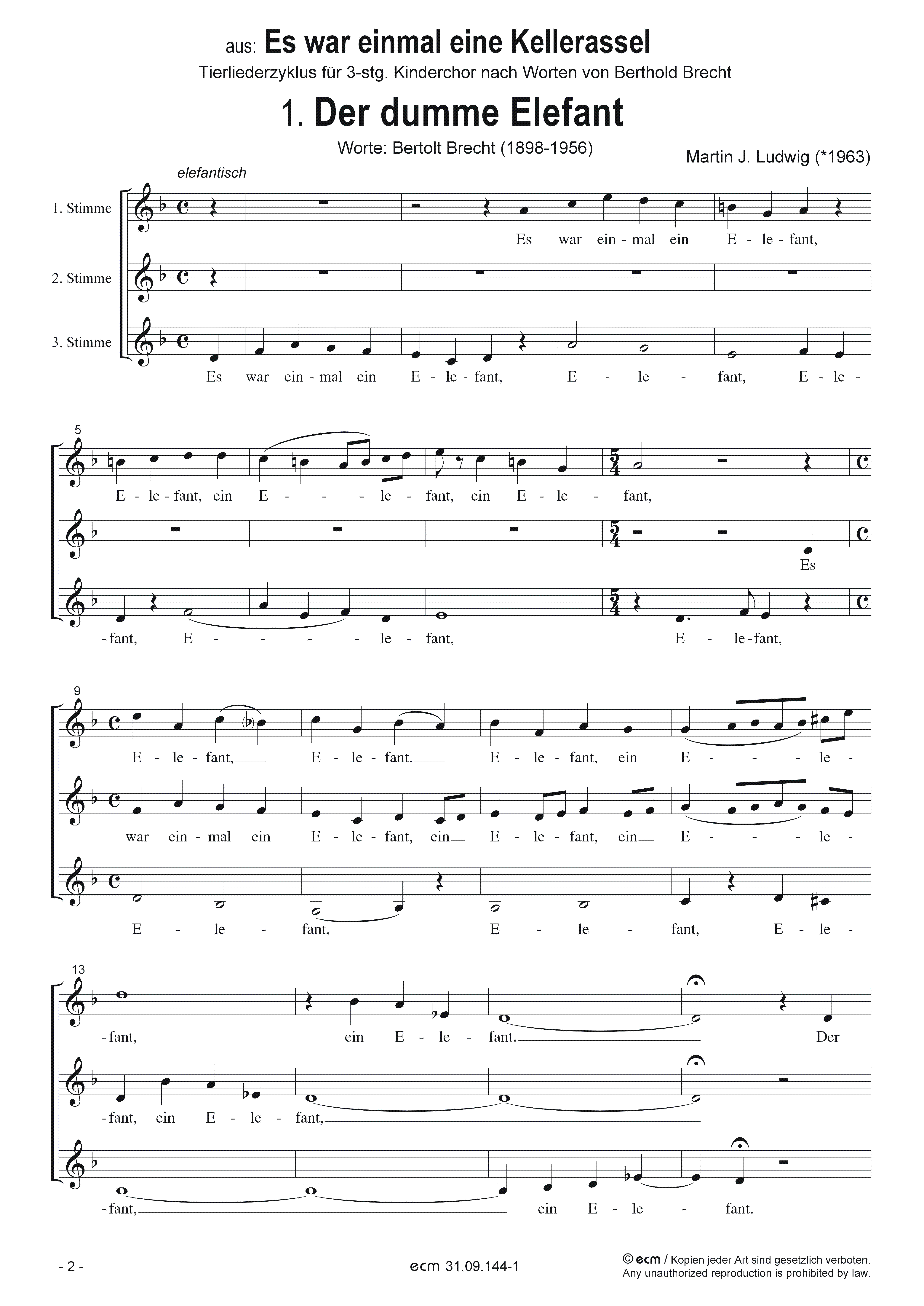 Nr.1 aus dem Tierliederzyklus „Es war einmal eine Kellerassel“ Besetzung: 3 Stimmen / Text: Bertolt Brecht (1898-1956) Sprache: deutsch / Tonart: d-Moll / Dauer: 1:50 Min. 1. Der dumme Elefant • 2. Rabe und Kanari • 3. Der Nichtschwimmer 4. Die Kellerassel • 5. Das Kamel • 6. Der Hund