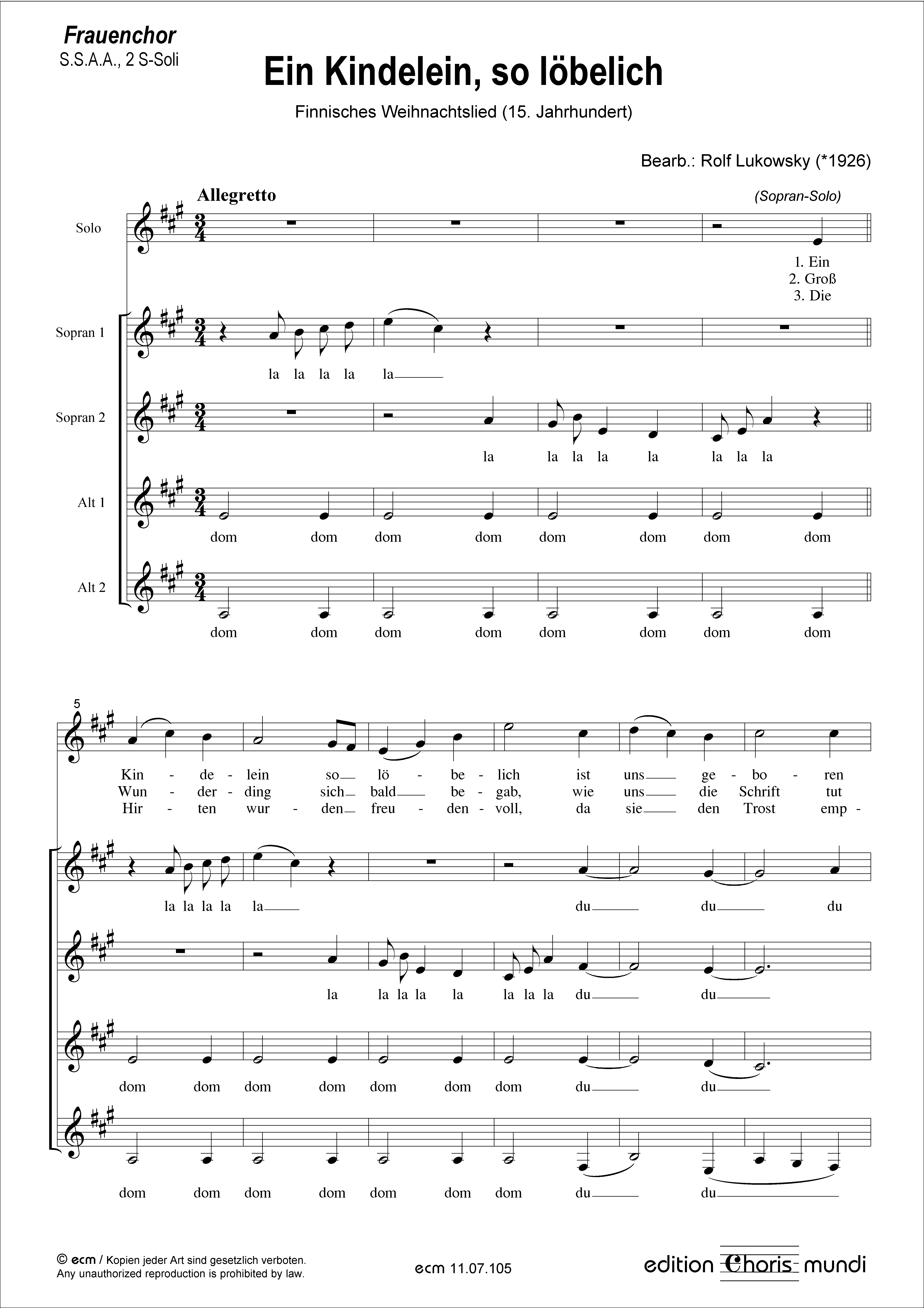 Besetzung: S.S.A.A., 2 Sopran-Soli / Text: Finnisches Weihnachtslied Sprache: deutsch / Tonart: A-Dur / Dauer: 3:30 Min.