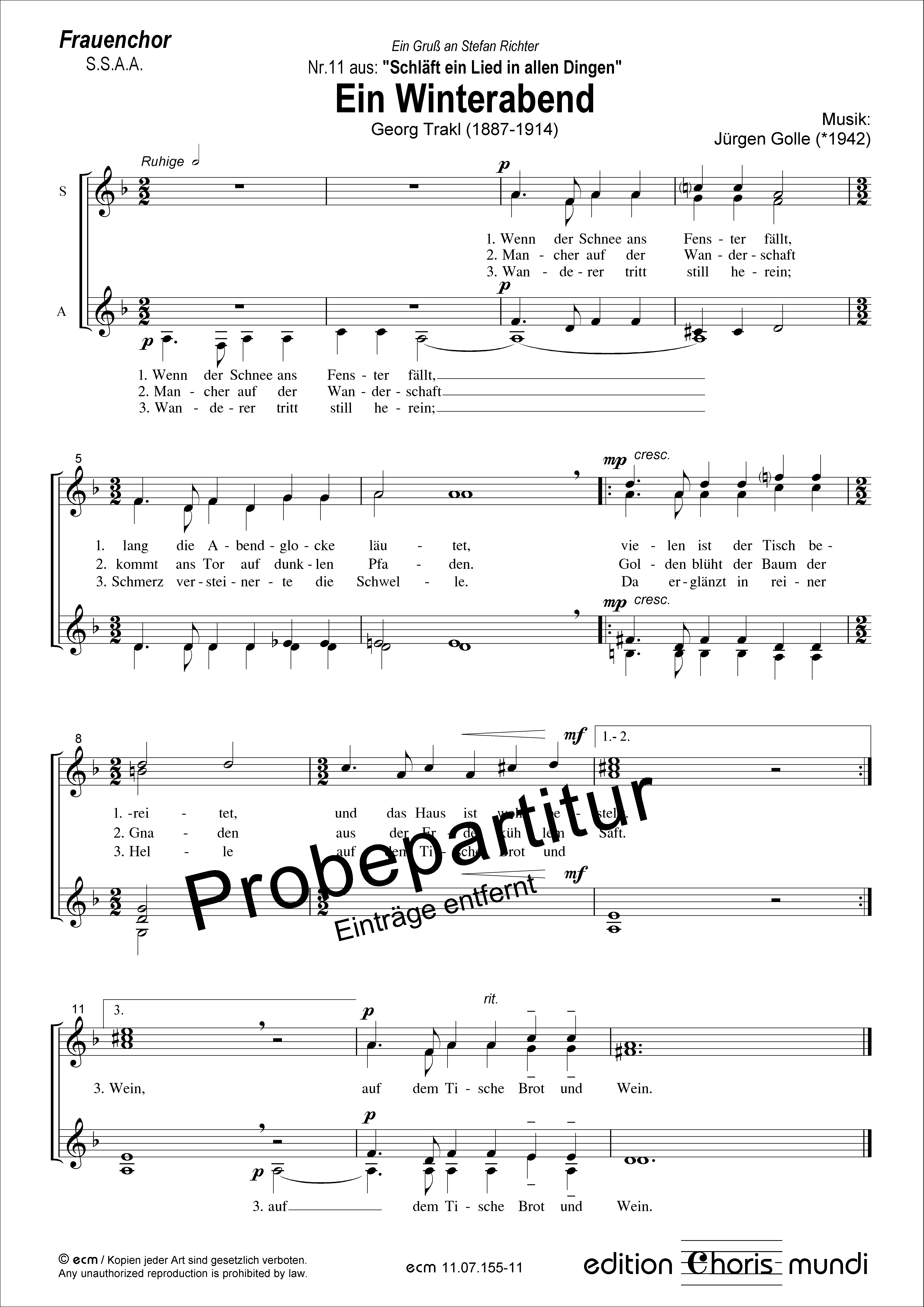 Nr.11 aus: "Schläft ein Lied in allen Dingen" Zyklus für gleiche Stimmen a cappella Besetzung: S.S.A.A. / Text: Georg Trakl (1887-1914) Sprache: deutsch / Tonart: d-Moll / Dauer: 2:15 Min. 1. Schläft ein Lied in allen Dingen • 2. Sonne, schieb die Wolken weg 3. Hagel im Frühling • 4. Juli • 5. Eine kleine Blume • 6. Spätsommerabend 7. Loblied auf den Wind • 8. Laternen • 9. Beim ersten Schnee 10. Ein Lied hinterm Ofen zu singen • 11. Ein Winterabend • 12. Weihnachten