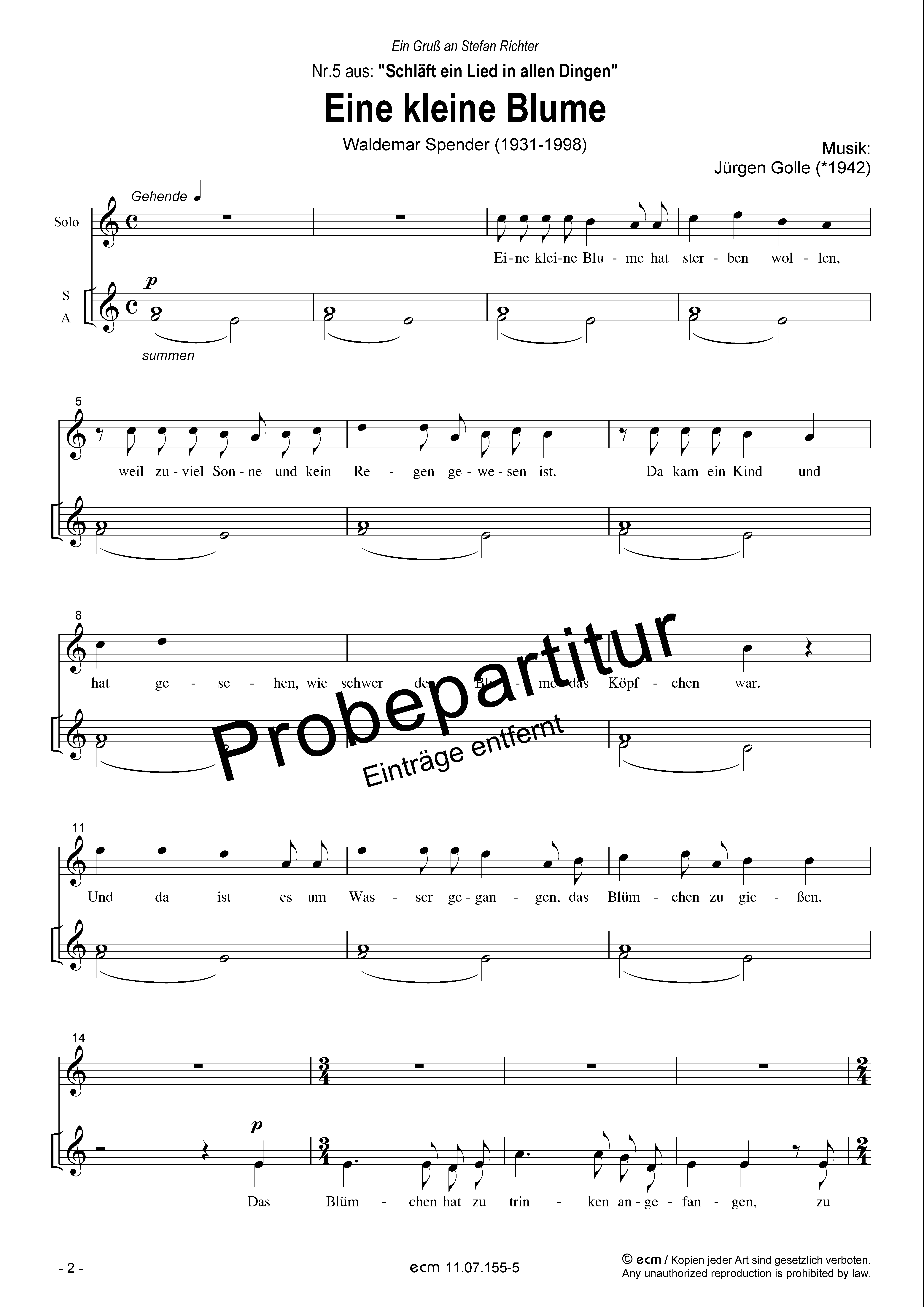Nr.5 aus: "Schläft ein Lied in allen Dingen" Zyklus für gleiche Stimmen a cappella Besetzung: S.A.(A.), S-Solo / Text: Waldemar Spender (1931-1998) Sprache: deutsch / Tonart: gemischt / Dauer: 1:30 Min. 1. Schläft ein Lied in allen Dingen • 2. Sonne, schieb die Wolken weg 3. Hagel im Frühling • 4. Juli • 5. Eine kleine Blume • 6. Spätsommerabend 7. Loblied auf den Wind • 8. Laternen • 9. Beim ersten Schnee 10. Ein Lied hinterm Ofen zu singen • 11. Ein Winterabend • 12. Weihnachten