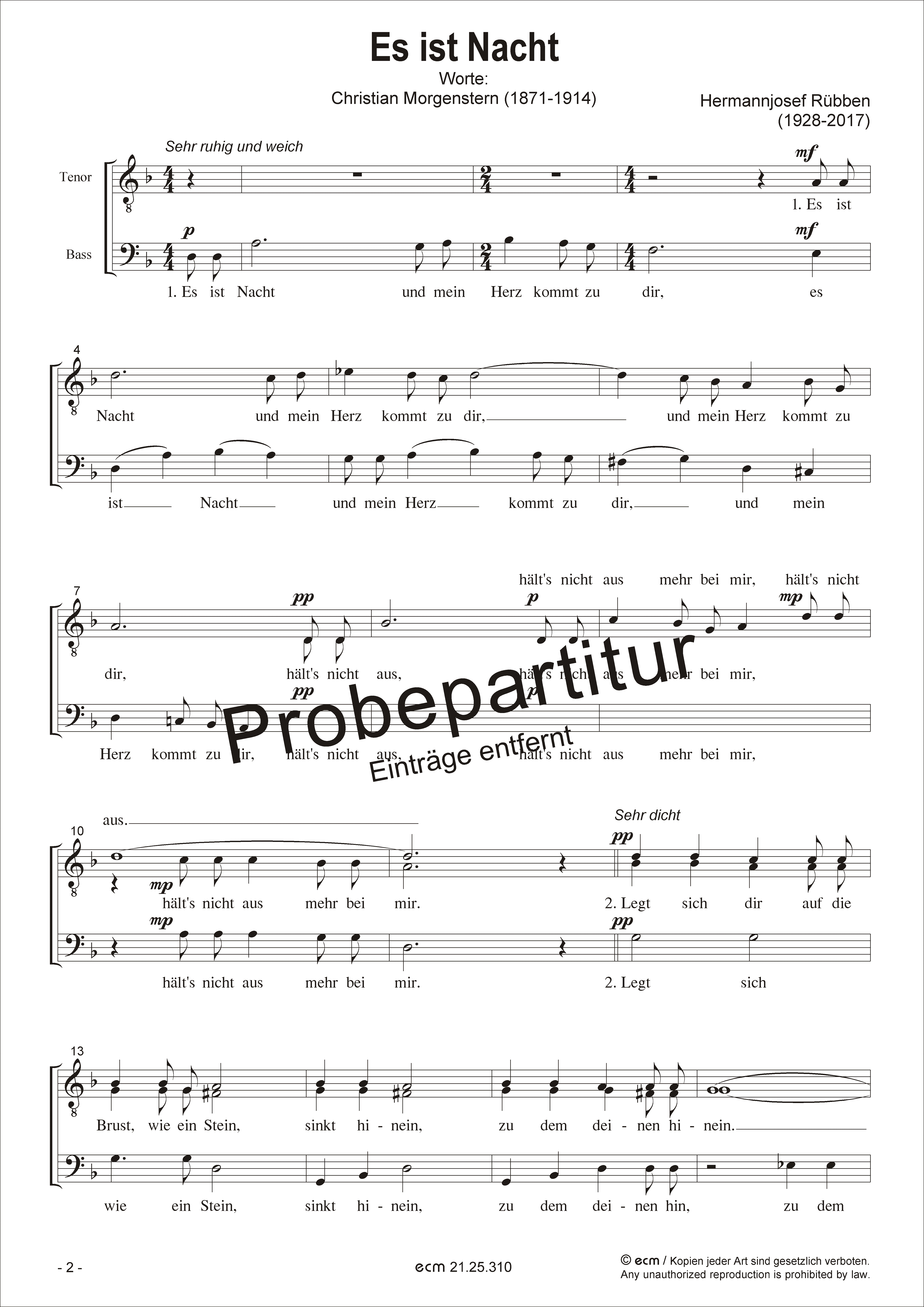 Besetzung: T.T.B.(B.) / Text: Christian Morgenstern (1871-1914) Sprache: deutsch / Tonart: d-Moll / Dauer: 2:30 Min. Dieses Werk ist auch in den Fassungen für Frauenchor und Gemischten Chor erhältlich.
