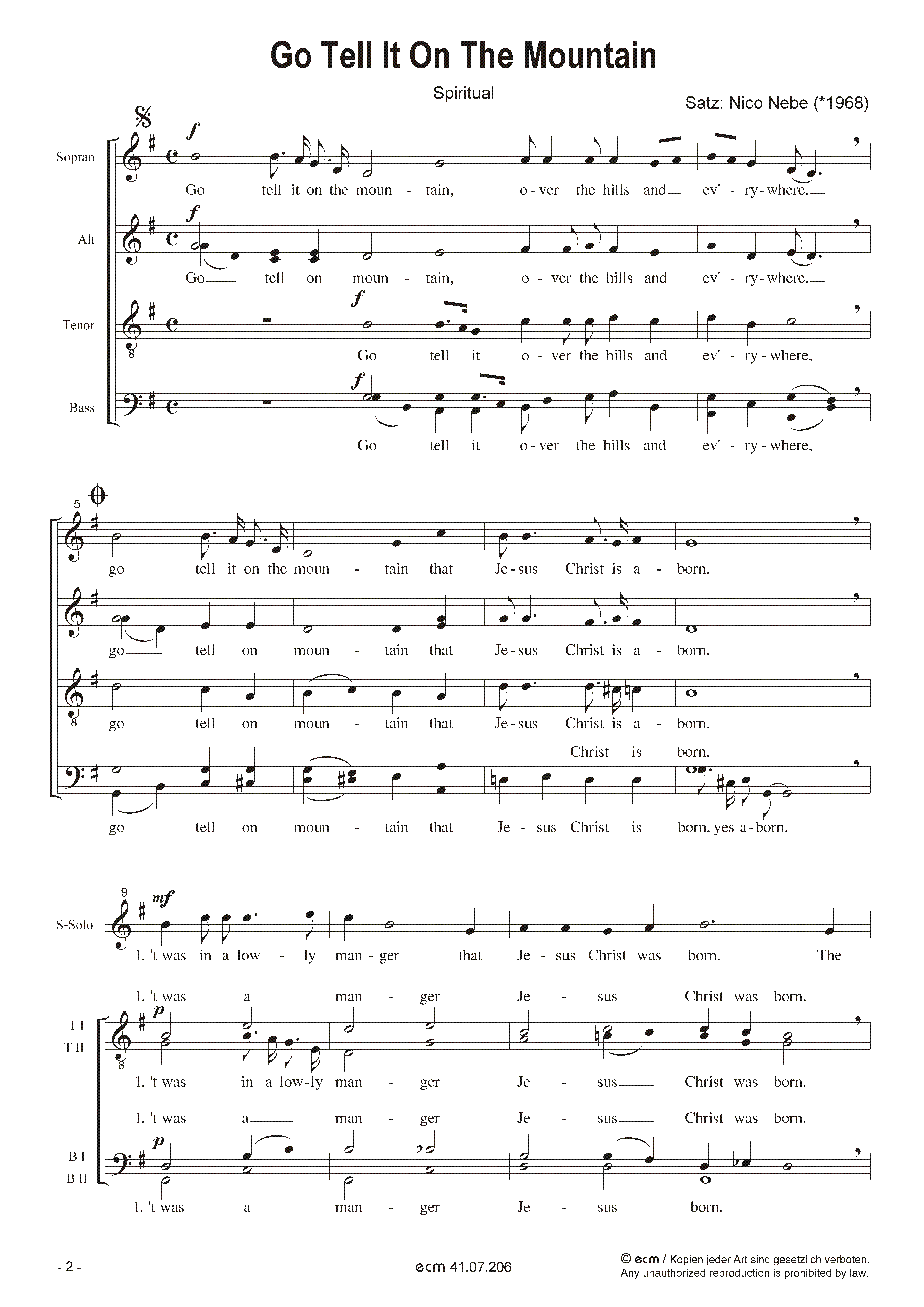 Dieser Satz ist auch in den Fassungen für Frauenchor und Männerchor erhältlich. Besetzung: S.A.A.T.B.B., S-S, T-S / Text: Spiritual Sprache: englisch / Tonart: G-Dur / Dauer: 2:30 Min.