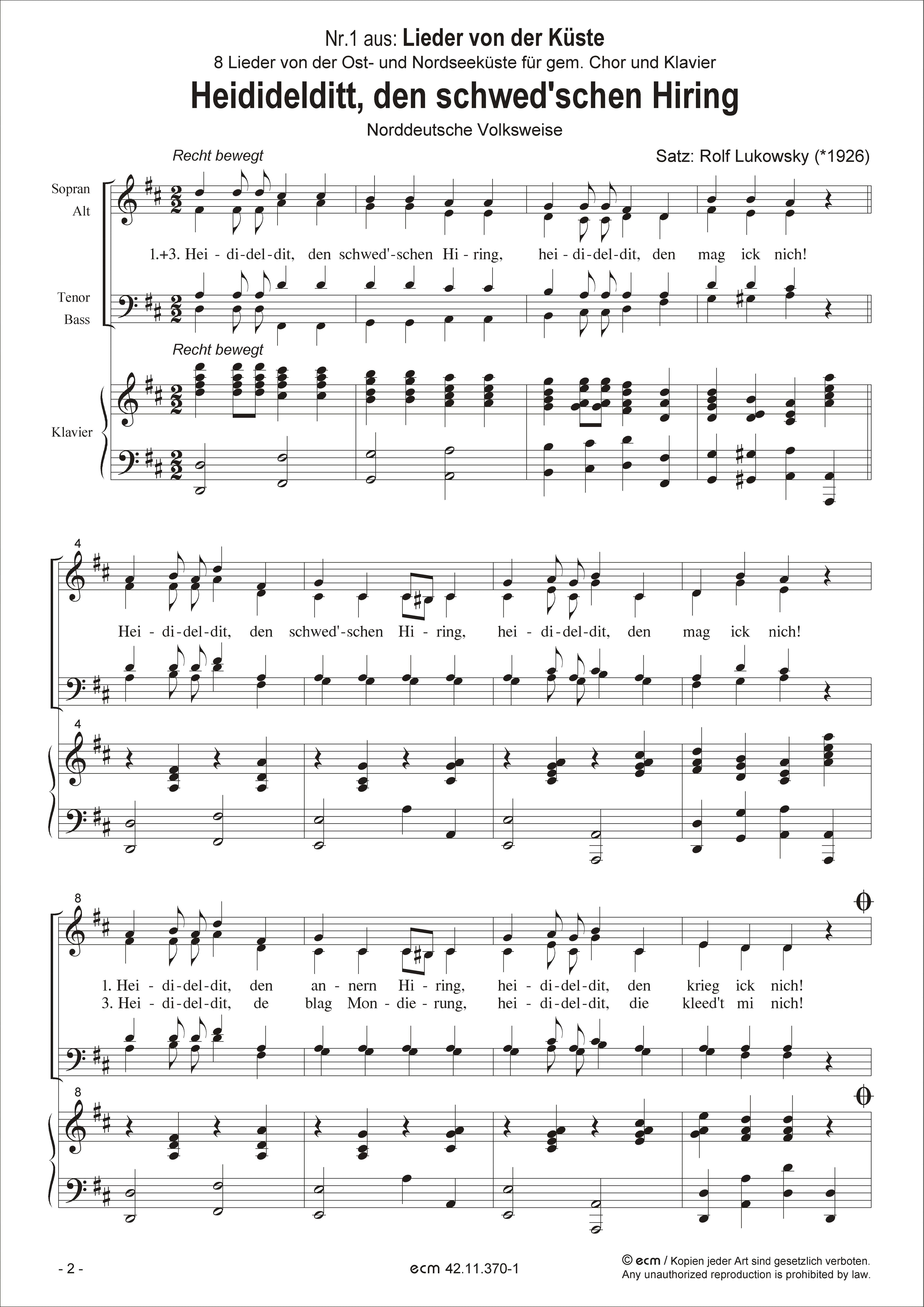 Nr.1 aus „Lieder von der Küste“ 1. Heididelditt, den schwed'schen Hiring • 2. Hal mi den Saalhund 3. Lütt Matten, dei Haas • 4. Gistern abend wier Vedder Michel dor 5. Von Stralsund - seggt hei • 6. Lütt Anna Susanna 7. Dat du min Leevsten büst • 8. Heididelditt, Marik is flietig Besetzung: S.A.T.B., Klavier / Text: Norddeutsches Volkslied Sprache: deutsch / Tonart: D-Dur / Dauer: 1:00 Min.