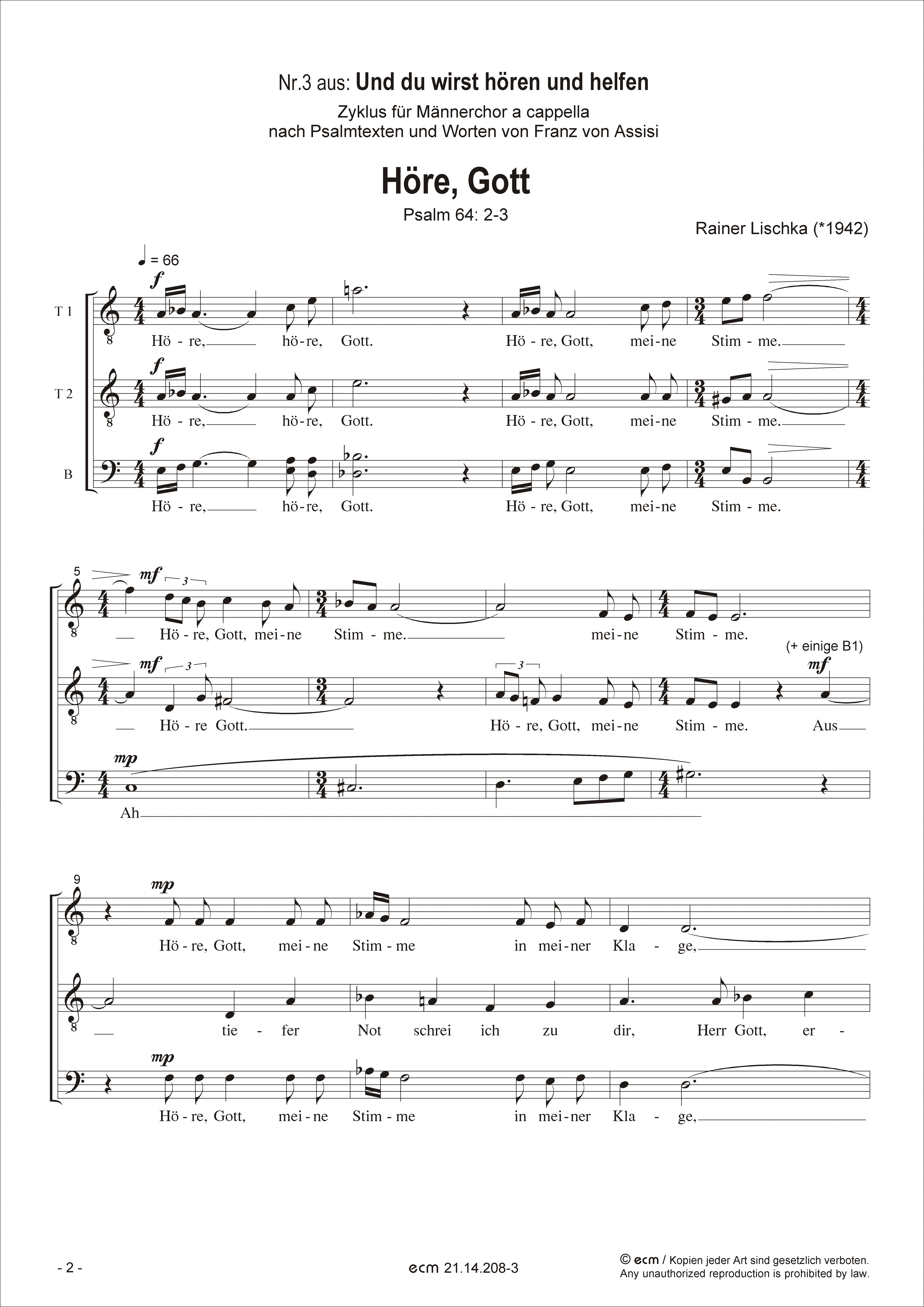 Nr.3 aus: Und du wirst hören und helfen Zyklus für Männerchor a cappella nach Psalmtexten und Worten von Franz von Assisi 1. Herr, warum? • 2. Tugenden • 3. Höre, Gott 4. Brüderlichkeit • 5. Gottvertrauen Besetzung: T.T.B. / Text: Psalm 64: 2-3 Sprache: deutsch / Tonart: gemischt / Dauer: 1:30 Min. Dieses Werk ist auch in der Fassung für Frauenchor erhältlich.