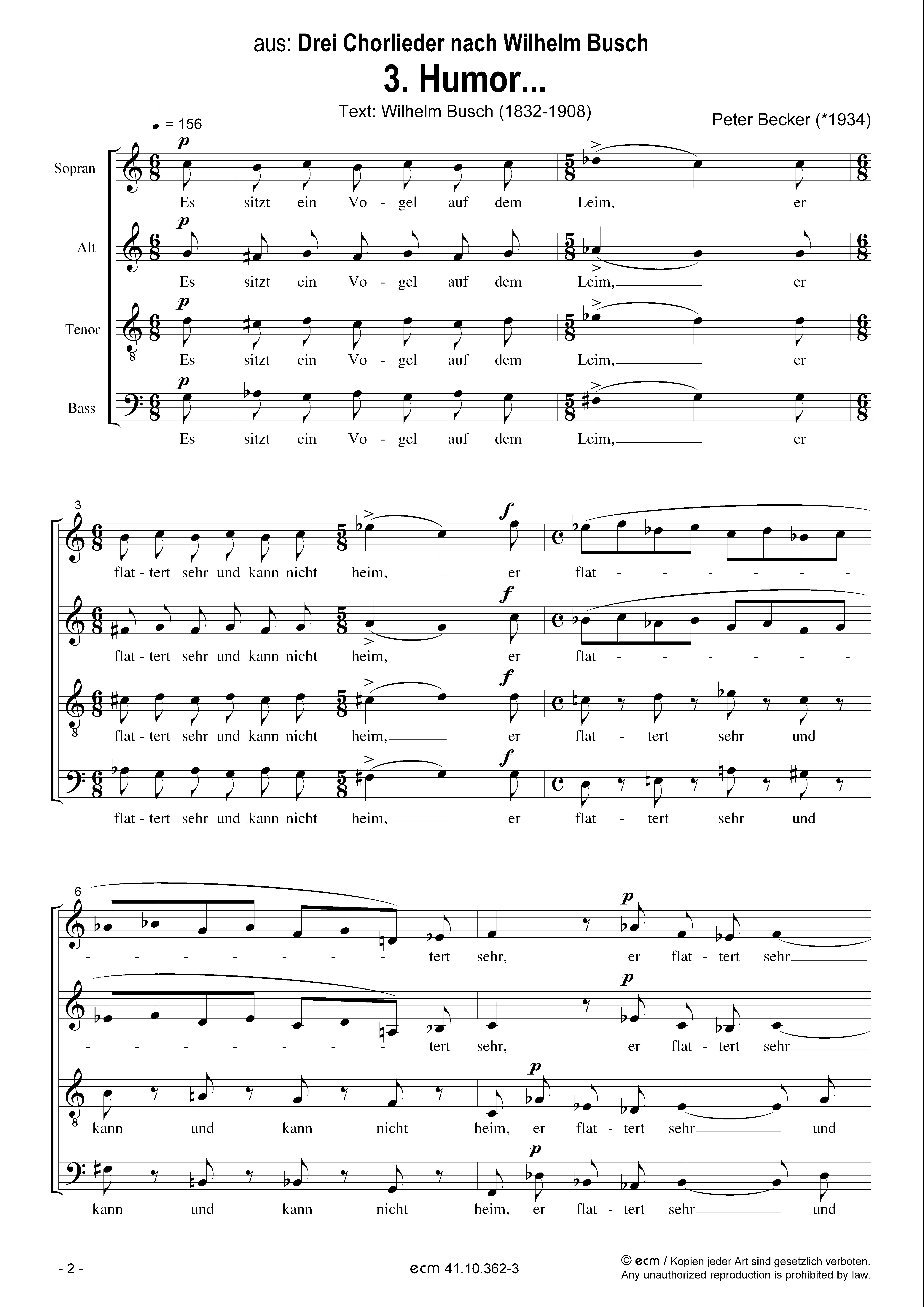 Nr.3 aus: Drei Chorlieder nach Wilhelm Busch Besetzung: S.A.T.B. / Text: Wilhelm Busch (1832-1908) Sprache: deutsch / Tonart: gemischt / Dauer: 1:40 Min. 1. Dunkle Zukunft • 2. Hinten herum • 3. Humor…