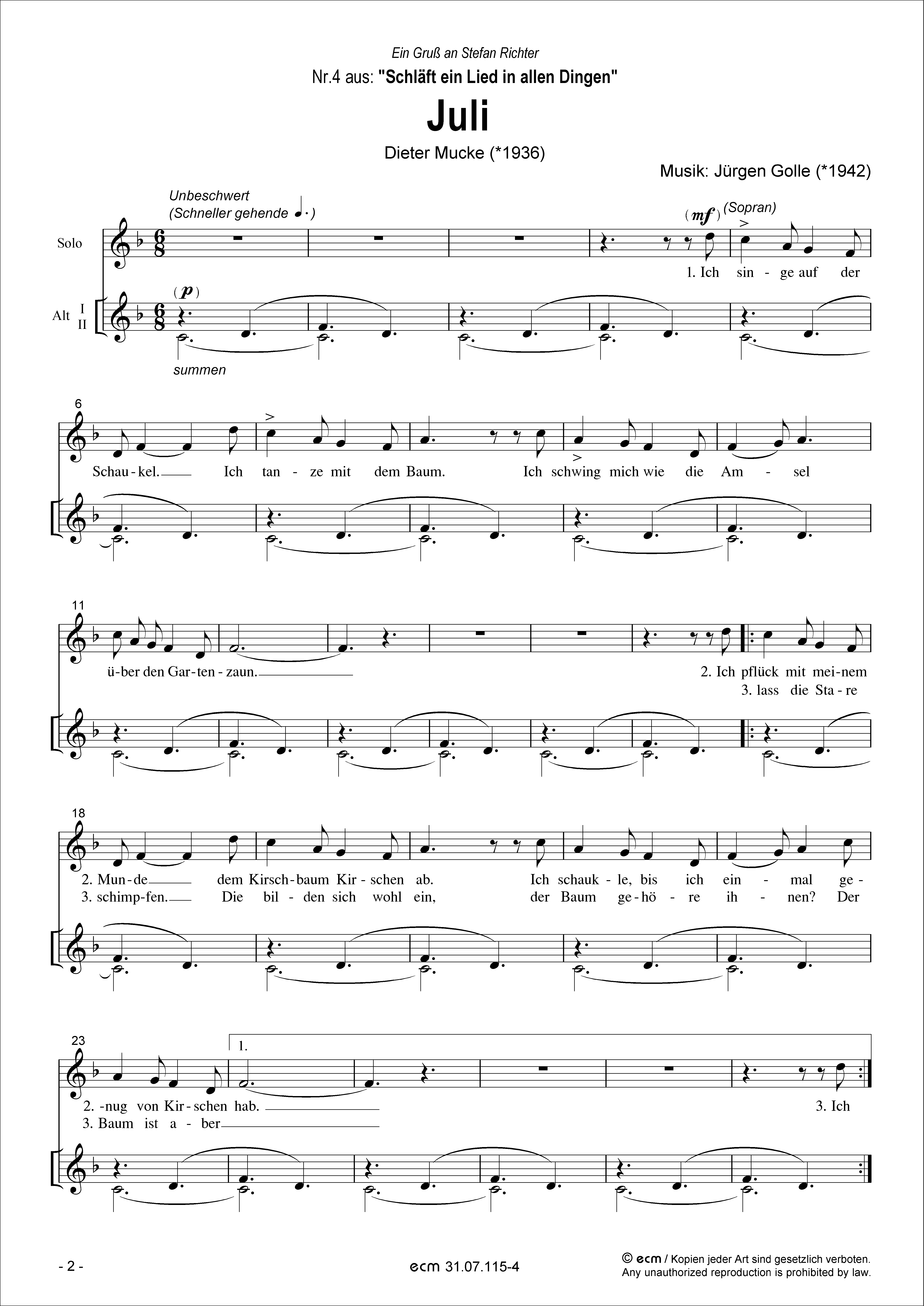 Nr.4 aus: "Schläft ein Lied in allen Dingen" Zyklus für gleiche Stimmen a cappella Besetzung: S.S.A.A., S-Solo / Text: Dieter Mucke (*1936) Sprache: deutsch / Tonart: F-Dur / Dauer: 1:30 Min. 1. Schläft ein Lied in allen Dingen • 2. Sonne, schieb die Wolken weg 3. Hagel im Frühling • 4. Juli • 5. Eine kleine Blume • 6. Spätsommerabend 7. Loblied auf den Wind • 8. Laternen • 9. Beim ersten Schnee 10. Ein Lied hinterm Ofen zu singen • 11. Ein Winterabend • 12. Weihnachten