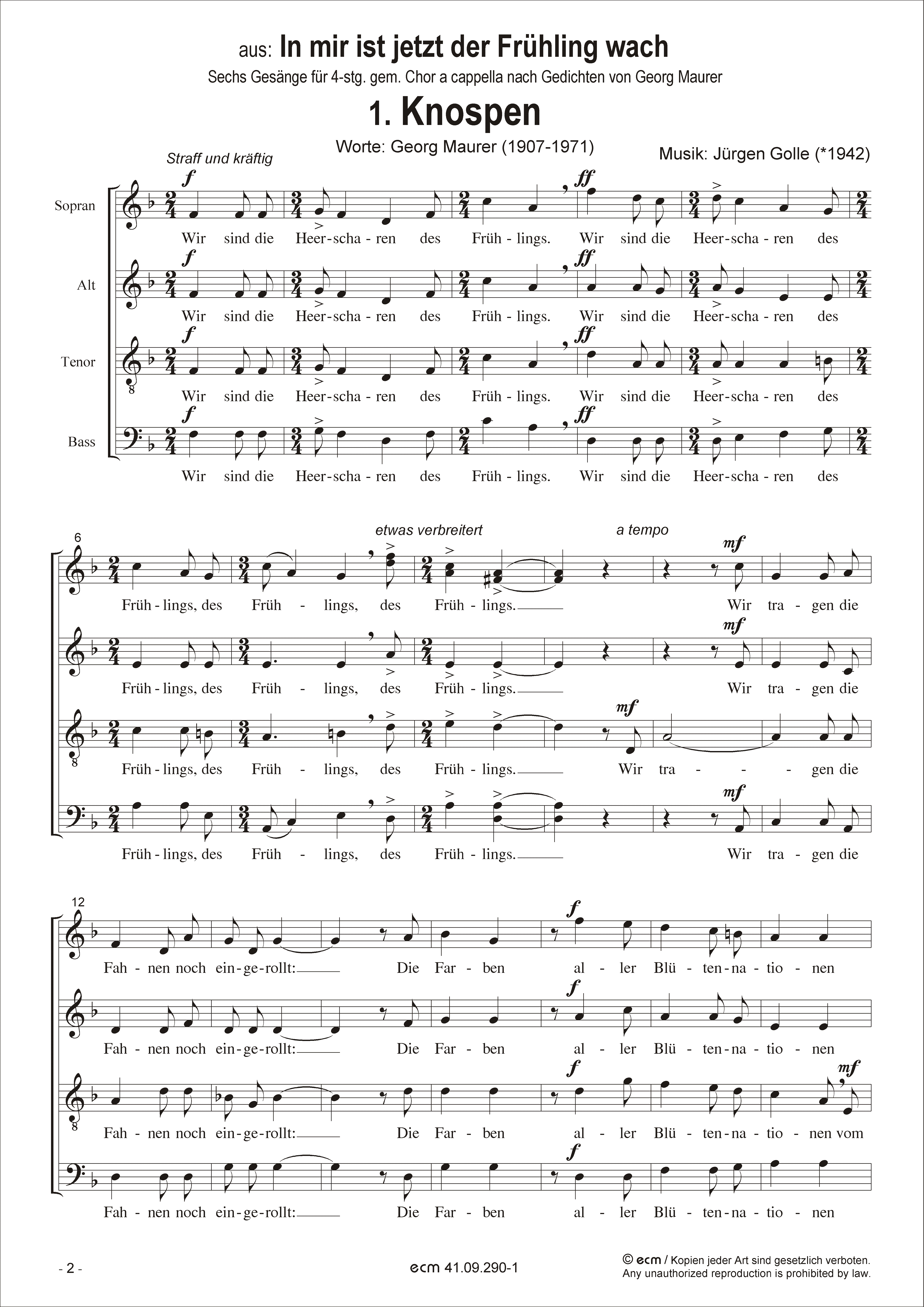 Nr.1 aus: In mir ist jetzt der Frühling wach Sechs Gesänge für 4-stimmigen gemischten Chor a cappella nach Gedichten von Georg Maurer 1. Knospen • 2. Vor dem Küssen • 3. Mittags • 4. Konzert 5. Die Nachtigall • 6. Wem der Friede in das Herz gedrungen Besetzung: S.A.T.B. / Text: Georg Maurer (1907-1971) Sprache: deutsch / Tonart: gemischt / Dauer: 2:15 Min.