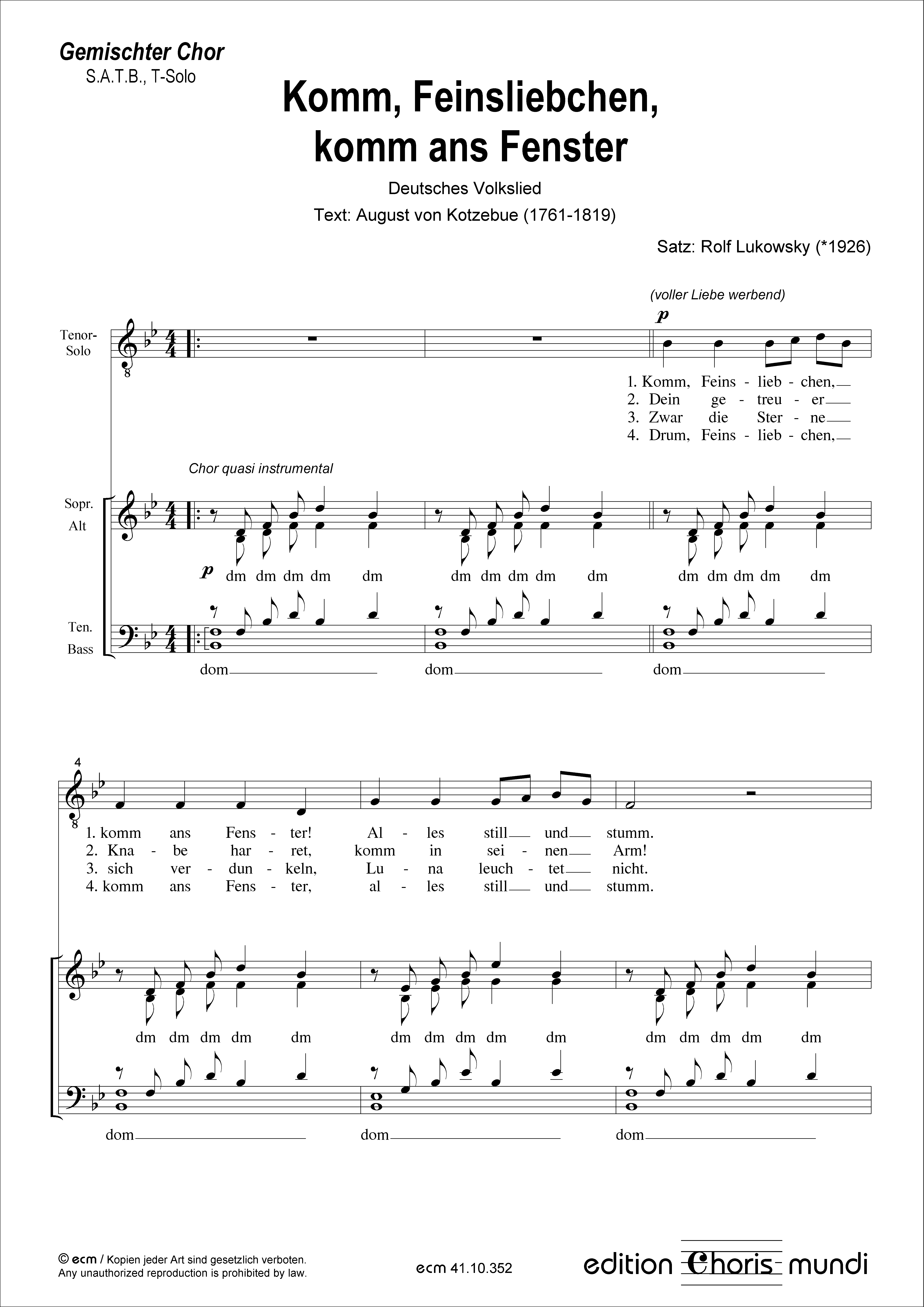 Deutsches Volkslied Dieser Satz ist auch in der Fassung für Frauenchor erhältlich. Besetzung: S.A.T.B., Tenor-Solo / Text: August von Kotzebue (1761-1819) Sprache: deutsch / Tonart: B-Dur / Dauer: 2:30 Min.