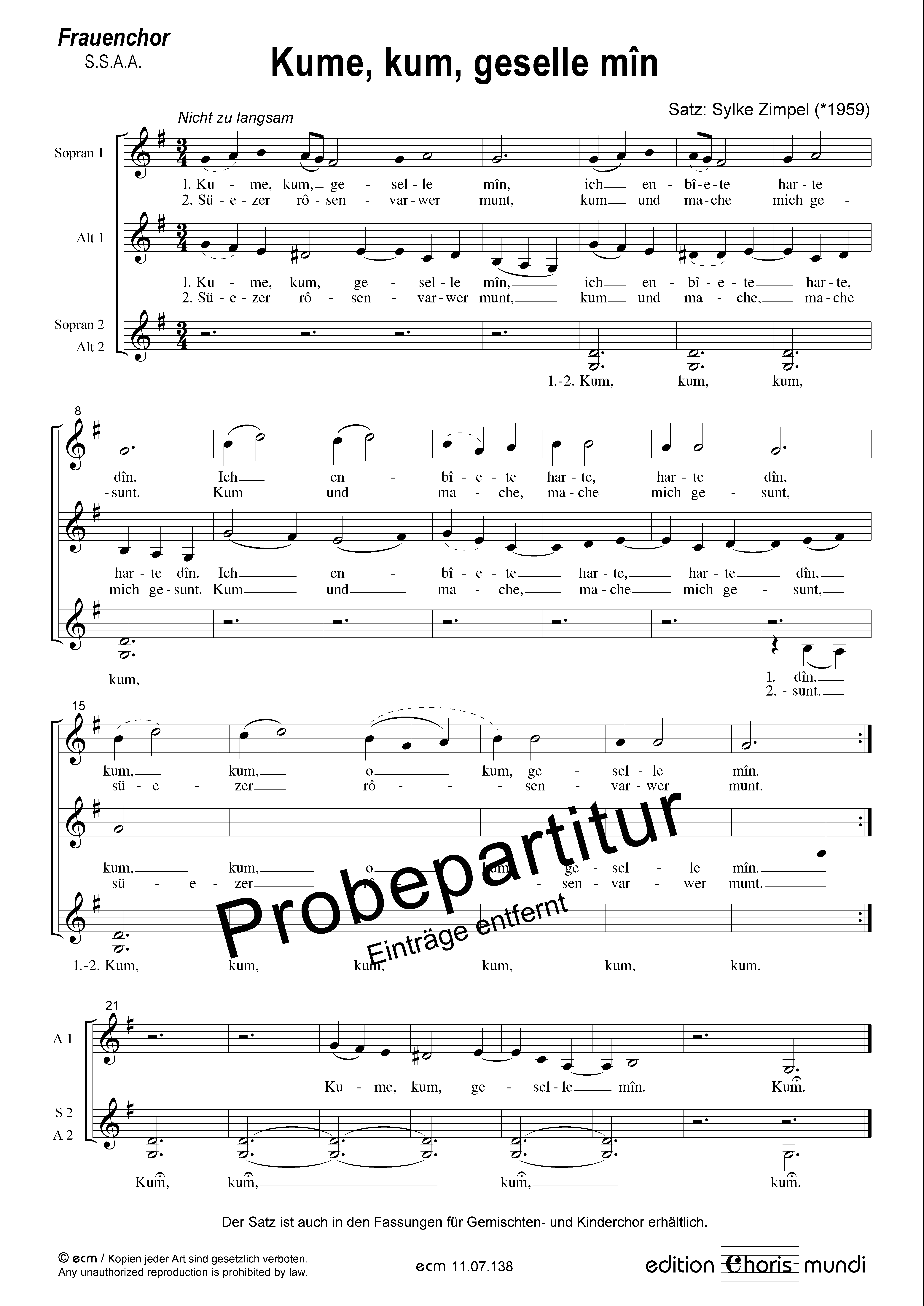 Besetzung: S.S.A.A. / Text: Deutsches Volkslied Sprache: deutsch / Tonart: A-Dur / Dauer: 1:50 Min.