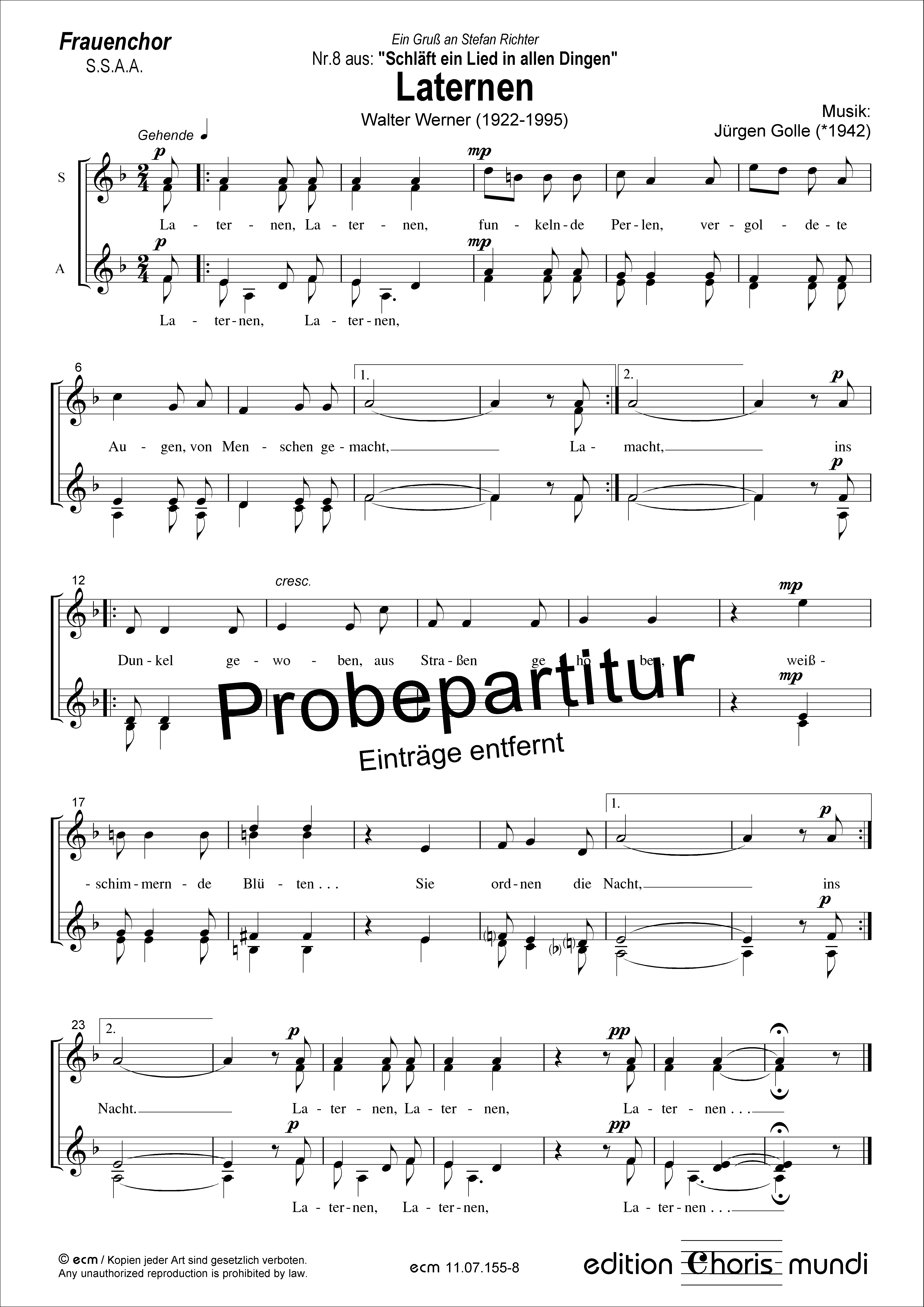 Nr.8 aus: "Schläft ein Lied in allen Dingen" Zyklus für gleiche Stimmen a cappella Besetzung: S.S.A.A. / Text: Walter Werner (1922-1995) Sprache: deutsch / Tonart: d-Moll / Dauer: 1:30 Min. 1. Schläft ein Lied in allen Dingen • 2. Sonne, schieb die Wolken weg 3. Hagel im Frühling • 4. Juli • 5. Eine kleine Blume • 6. Spätsommerabend 7. Loblied auf den Wind • 8. Laternen • 9. Beim ersten Schnee 10. Ein Lied hinterm Ofen zu singen • 11. Ein Winterabend • 12. Weihnachten