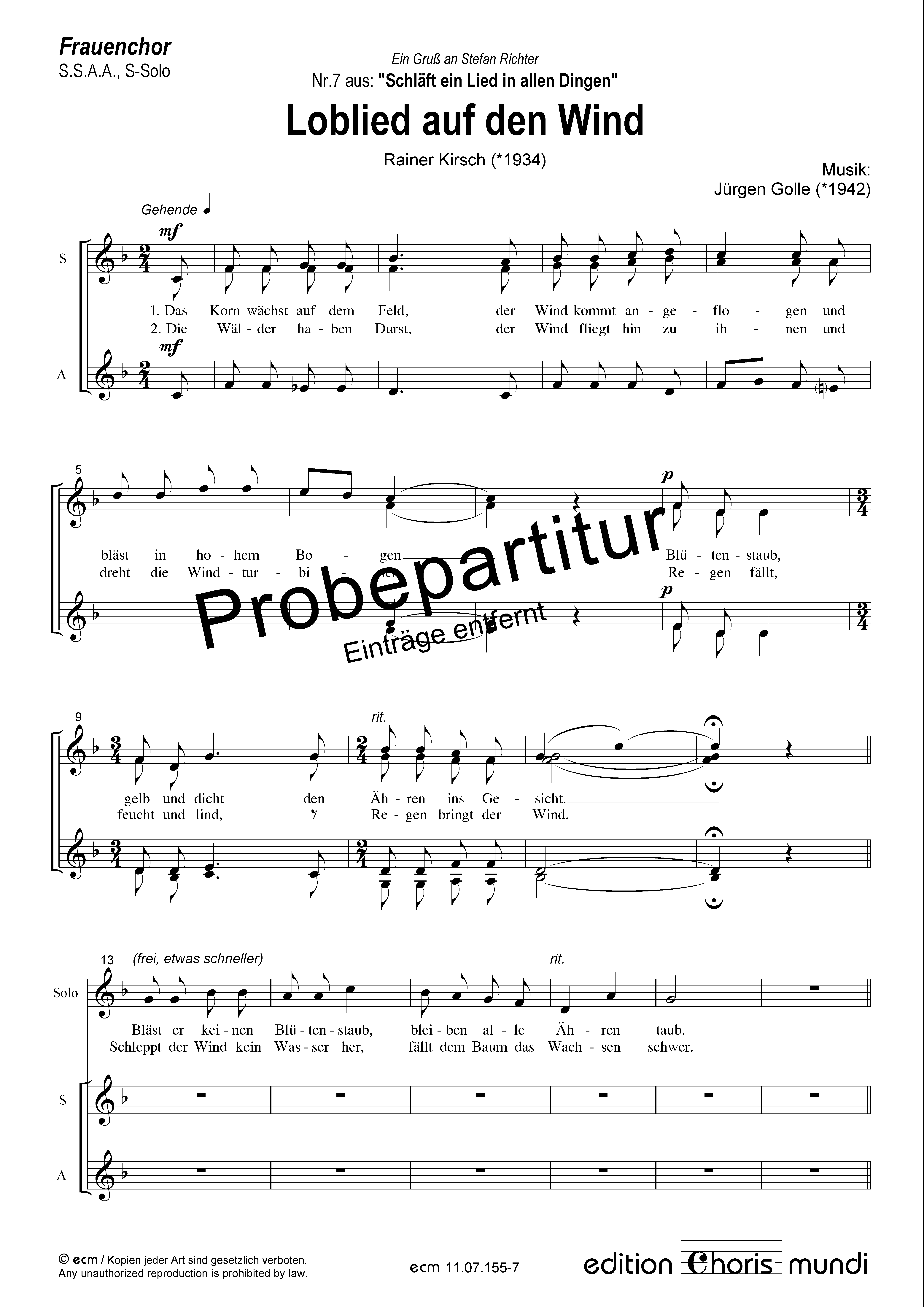 Nr.7 aus: "Schläft ein Lied in allen Dingen" Zyklus für gleiche Stimmen a cappella Besetzung: S.S.A.A., S-Solo / Text: Rainer Kirsch (*1934) Sprache: deutsch / Tonart: F-Dur / Dauer: 1:30 Min. 1. Schläft ein Lied in allen Dingen • 2. Sonne, schieb die Wolken weg 3. Hagel im Frühling • 4. Juli • 5. Eine kleine Blume • 6. Spätsommerabend 7. Loblied auf den Wind • 8. Laternen • 9. Beim ersten Schnee 10. Ein Lied hinterm Ofen zu singen • 11. Ein Winterabend • 12. Weihnachten