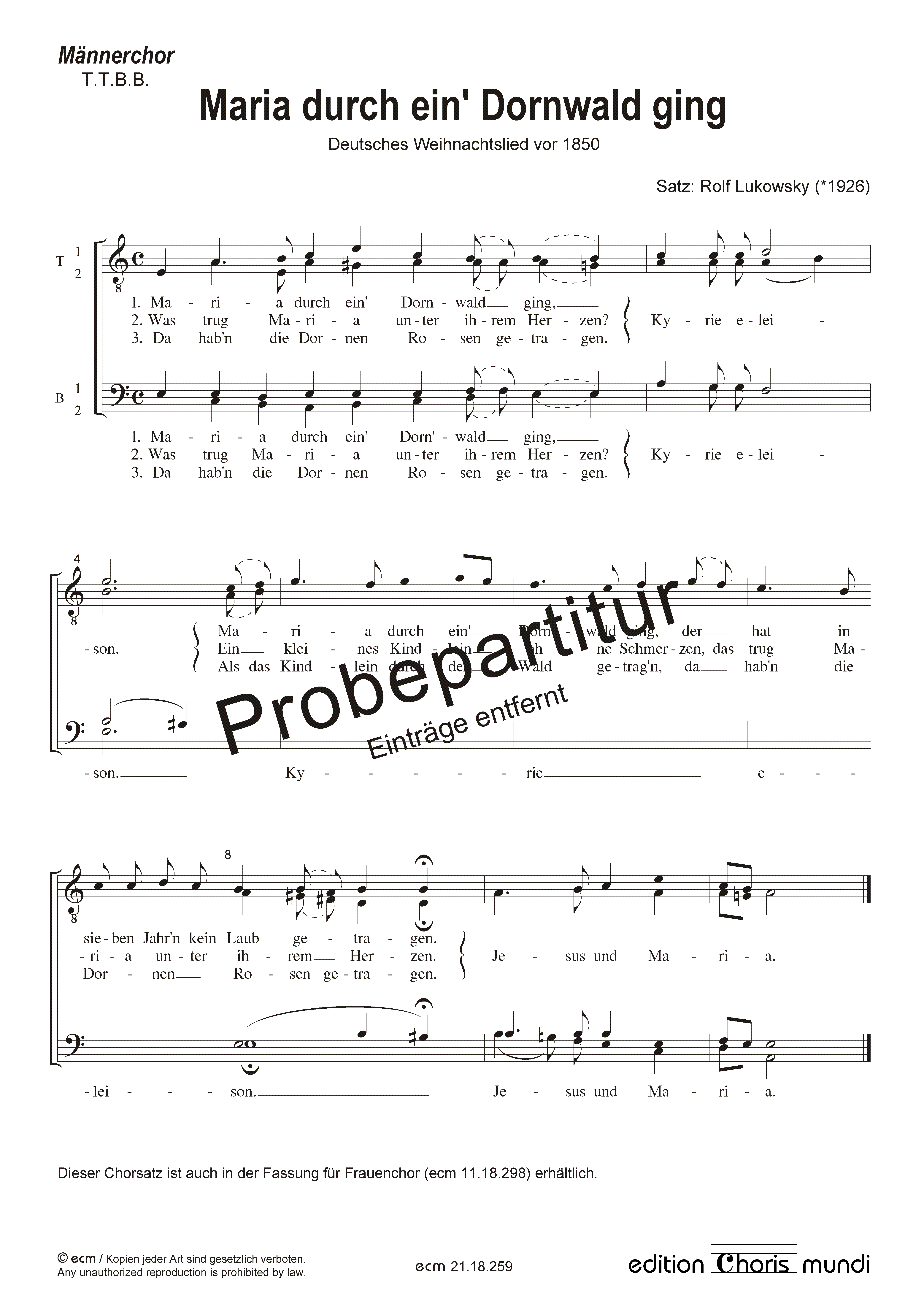 Dieser Satz ist auch in der Fassung für Frauenchor erhältlich. Besetzung: T.T.B.B. / Text: Deutsches Weihnachtslied vor 1850 Sprache: deutsch / Tonart: a-Moll / Dauer: 1:40 Min.