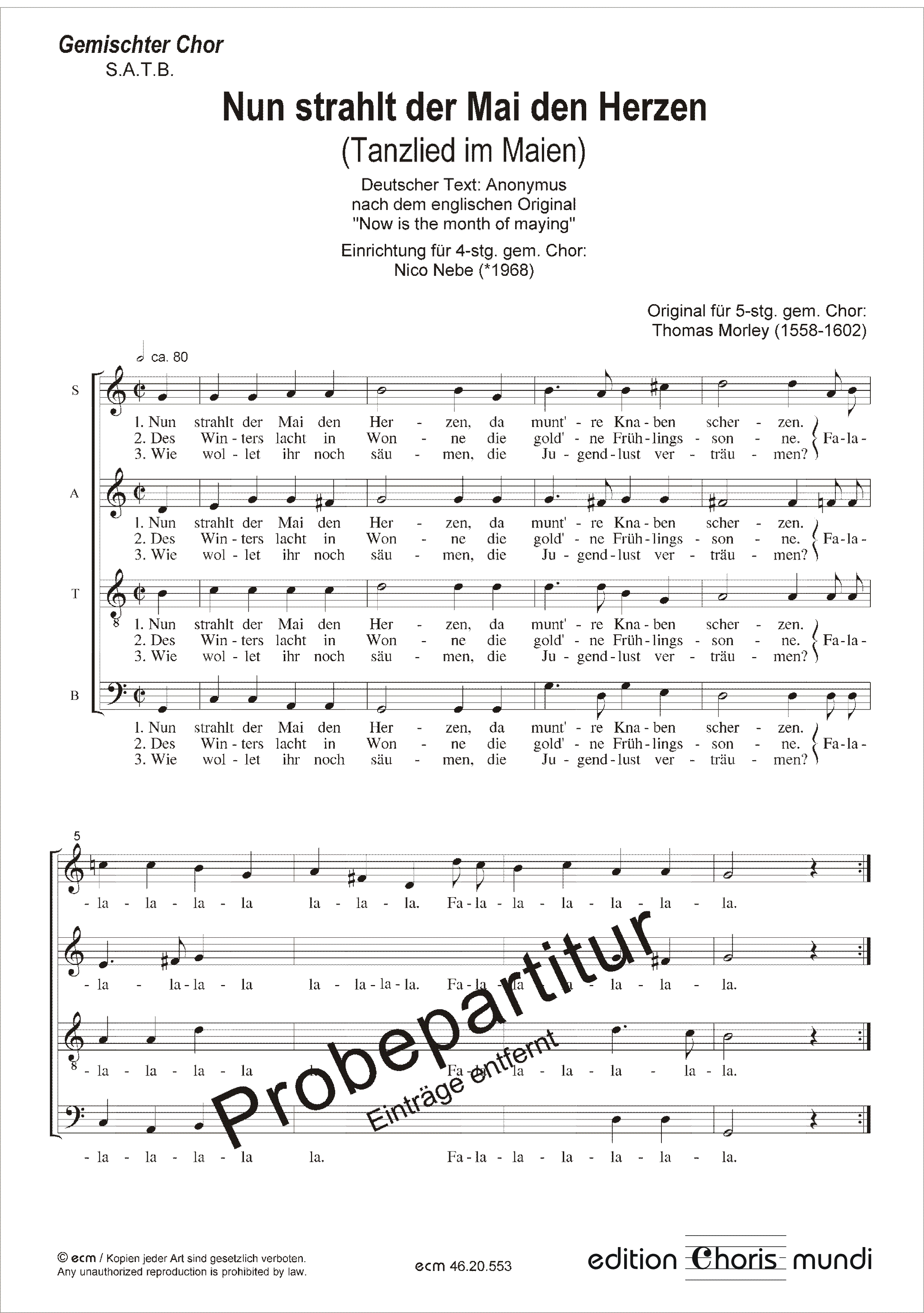 (Tanzlied im Maien / Now is the month of maying) Besetzung: S.A.T.B. / Text: Anonymus Sprache: deutsch / Tonart: G-Dur / Dauer: 2:30 Min. Dieses Werk ist in folgenden Fassungen erhältlich: Gemischter Chor: S.S.A.T.B. • Gemischter Chor: S.A.T.B. • Gemischter Chor: S.A.Bar. Frauenchor: S.S.A.A. • Gleiche Stimmen: S.S.A. Männerchor: T.T.B.B.
