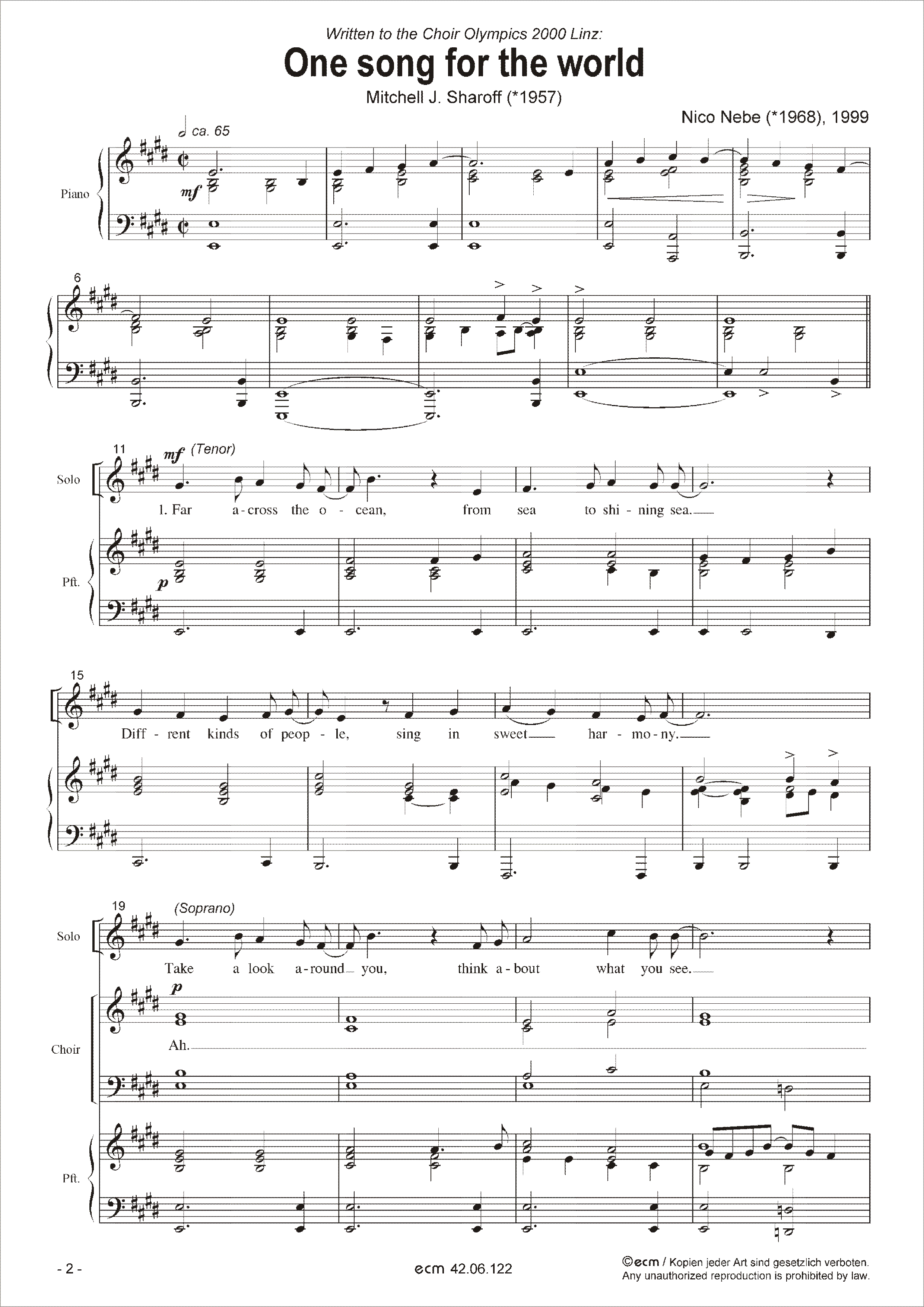 Komponiert für die Chorolympiade in Linz, 2000. Auch erhältlich in der Fassung für großes Orchester und Band. Besetzung: S.A.T.B., S-Solo, T-Solo, Klavier / Text: Mitchell J. Sharoff Sprache: englisch / Tonart: E-Dur; F-Dur / Dauer: 3:20 Min.