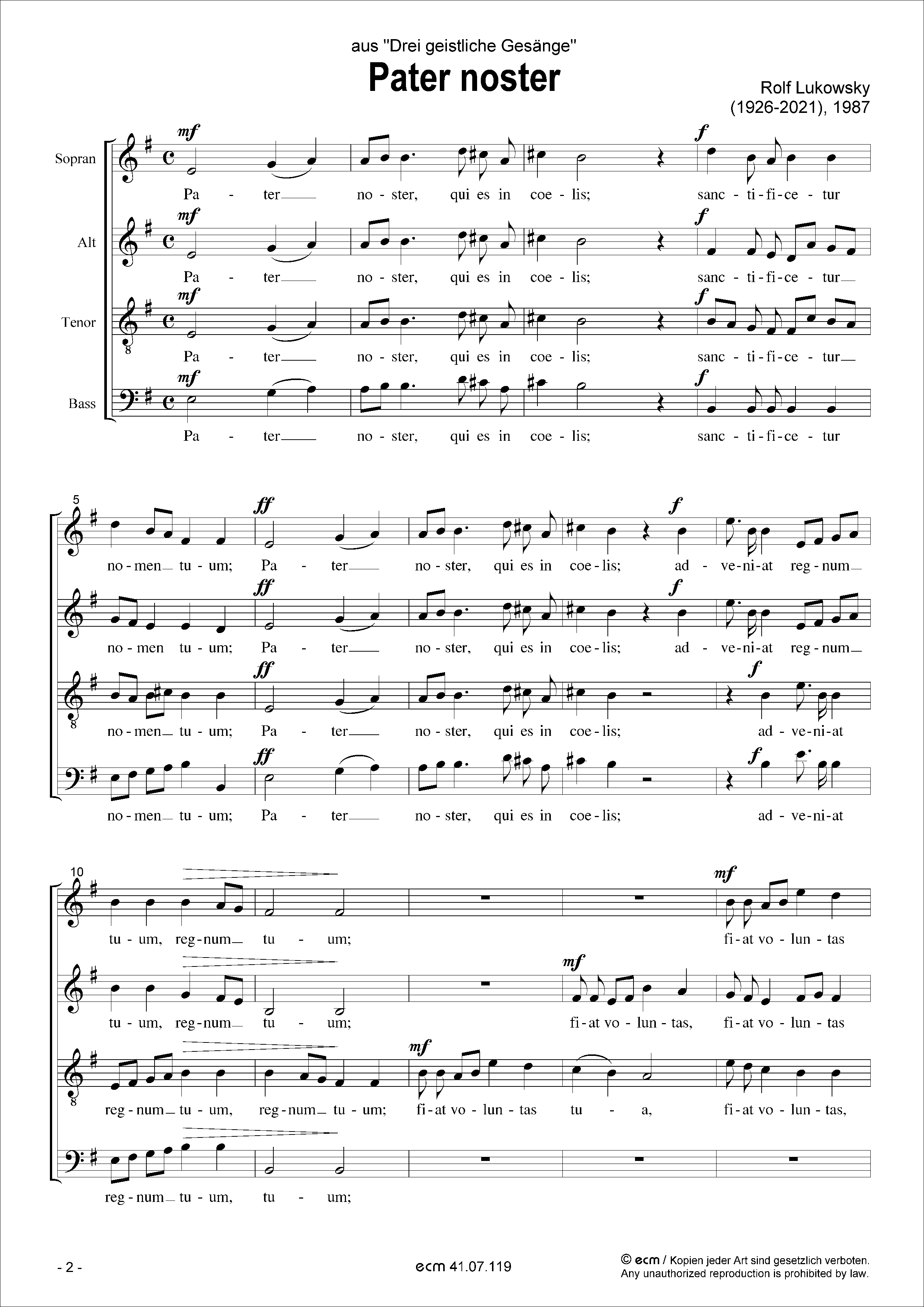 aus: Drei geistliche Gesänge (erhältlich als Einzelausgaben) • Ave Maria • Pater noster • Salve, Regina Besetzung: S.A.T.B. / Text: - Sprache: lateinisch / Tonart: gemischt / Dauer: 2:10 Min. Dieses Werk ist auch in den Fassungen für Frauenchor und Männerchor erhältlich.