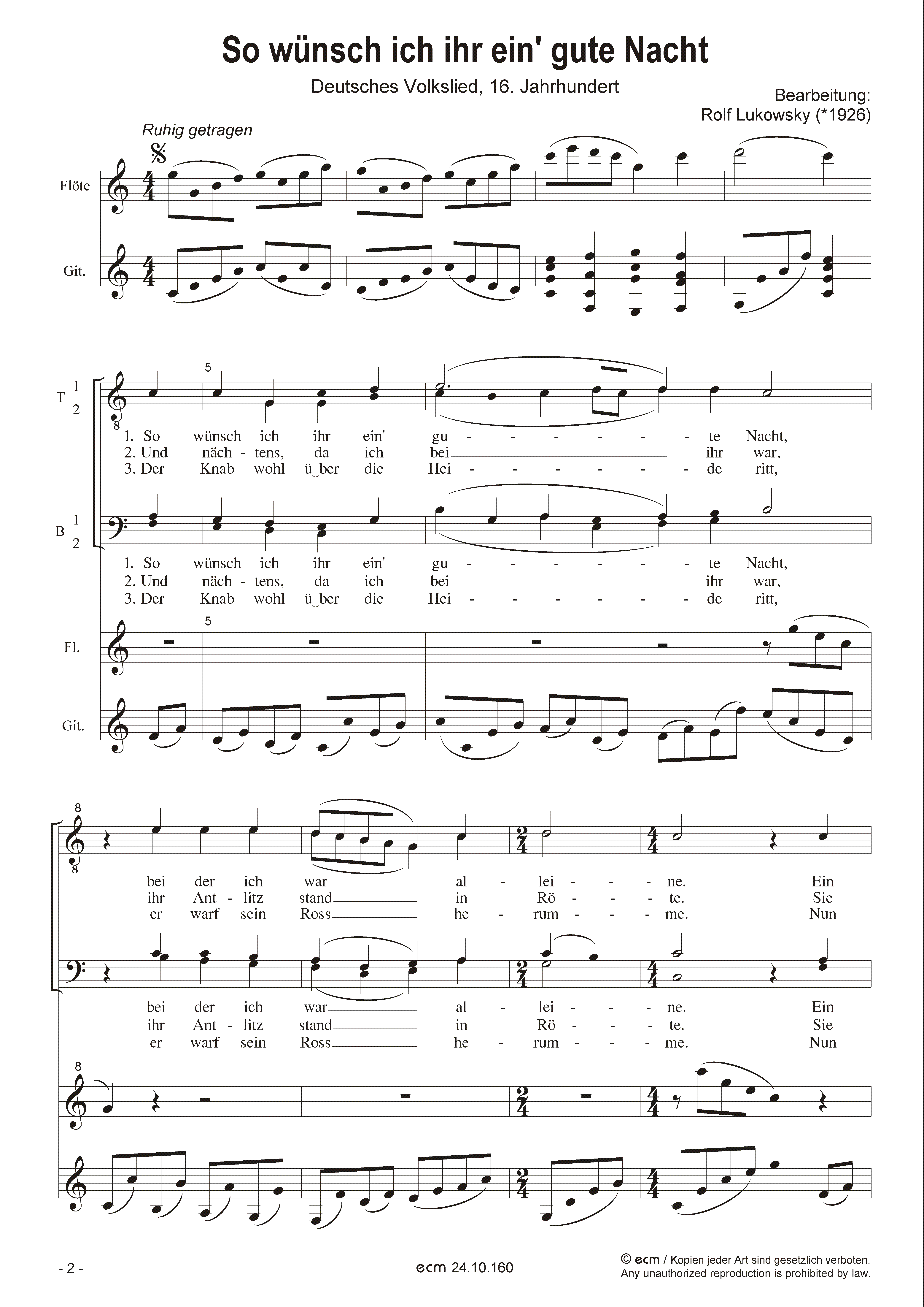Erhältlich in den Fassungen: • Männerchor mit Klavier • Männerchor mit Gitarre • Männerchor mit Gitarre und Flöte Besetzung: T.T.B.B., Gitarre, Flöte / Text: Deutsches Volkslied, 16. Jh. Sprache: deutsch / Tonart: C-Dur / Dauer: 3:30 Min.