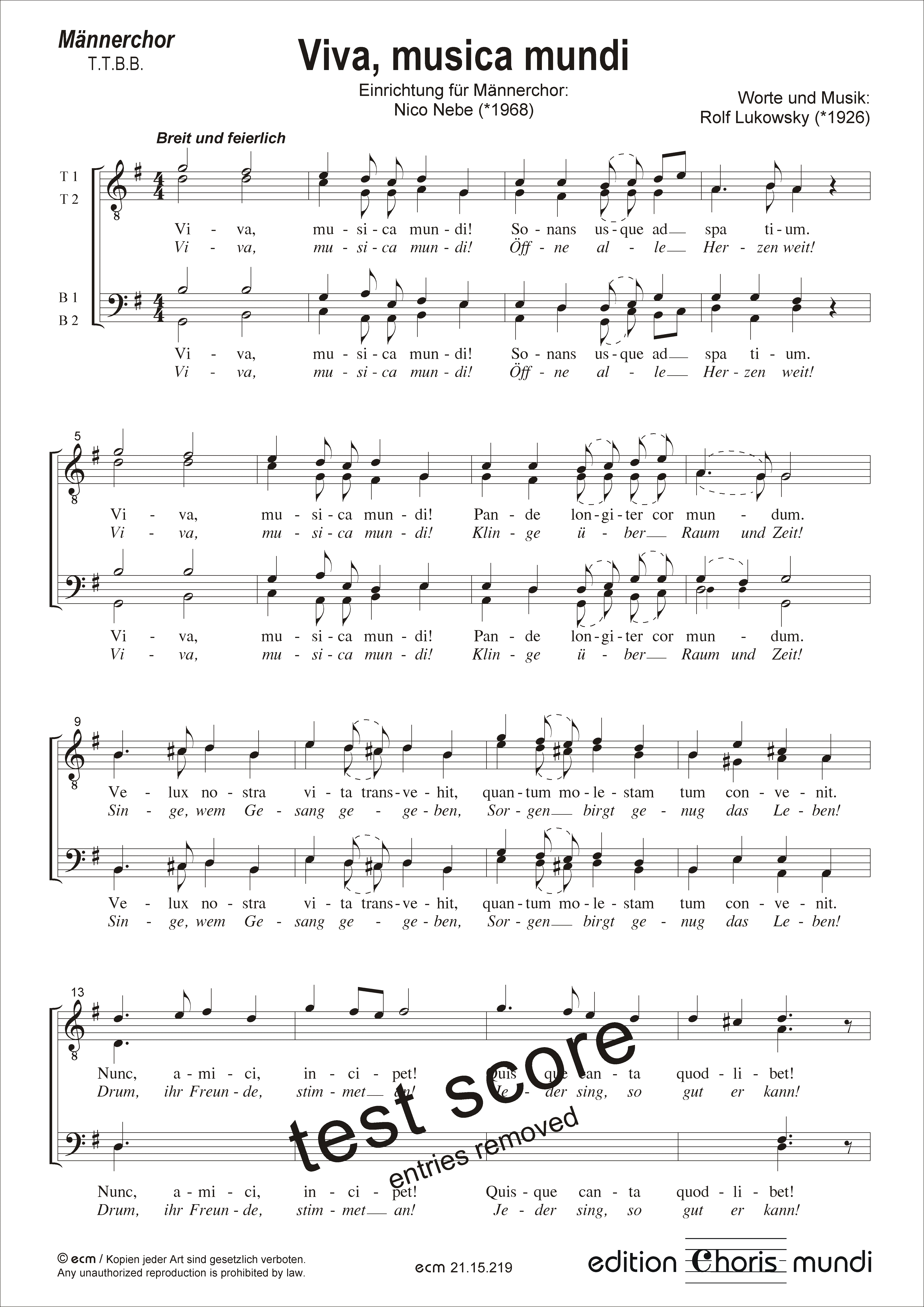Dieser Satz ist folgenden Varianten erhältlich: Gemischter Chor a cappella • Gemischter Chor mit Klavier Frauenchor a cappella • Frauenchor mit Klavier Männerchor a cappella • Männerchor mit Klavier Besetzung: T.T.B.B. / Text: Rolf Lukowsky (*1926) Sprache: lateinisch - deutsch / Tonart: G-Dur / Dauer: 2:20 Min.