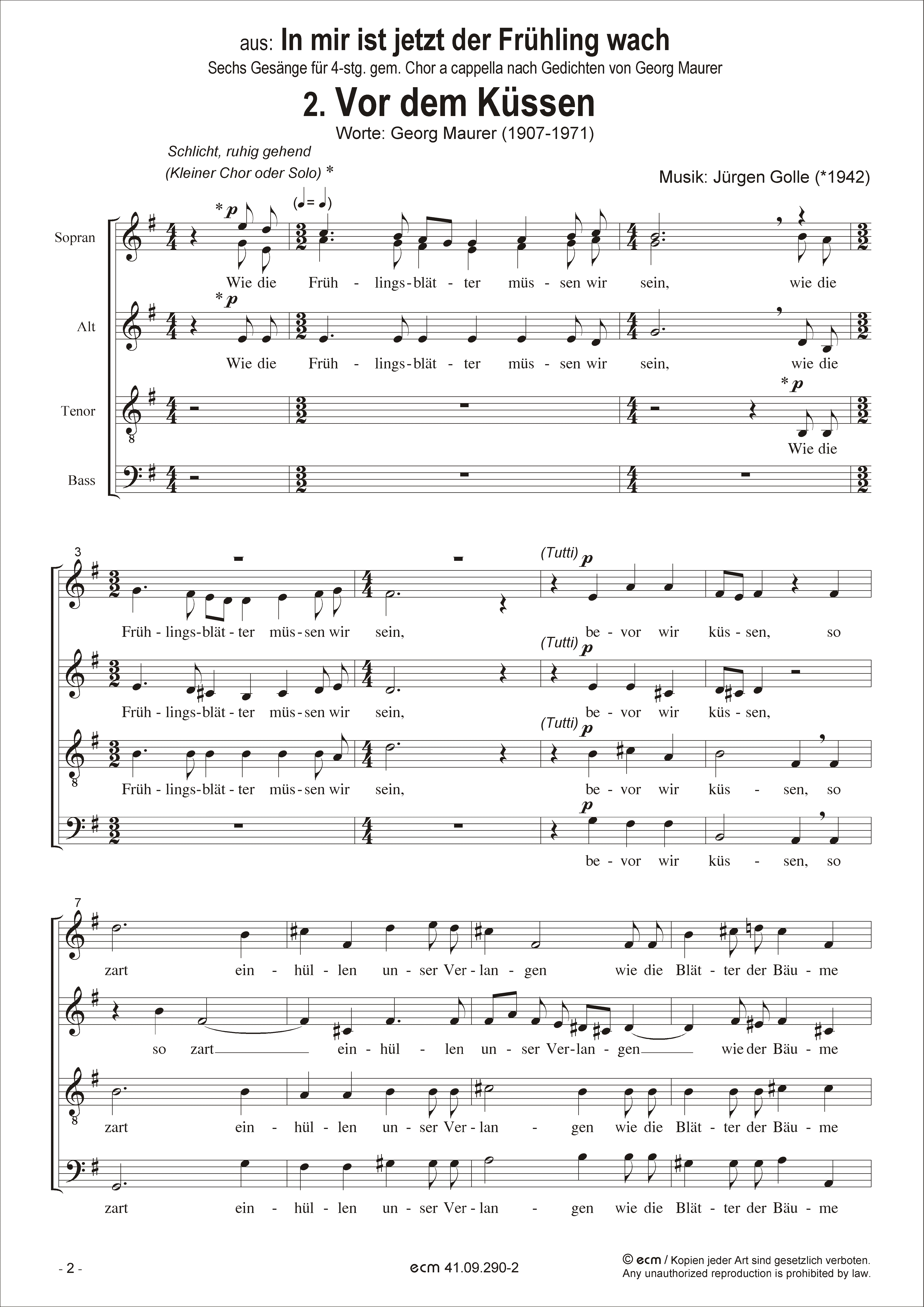 Nr.2 aus: In mir ist jetzt der Frühling wach Sechs Gesänge für 4-stimmigen gemischten Chor a cappella nach Gedichten von Georg Maurer 1. Knospen • 2. Vor dem Küssen • 3. Mittags • 4. Konzert 5. Die Nachtigall • 6. Wem der Friede in das Herz gedrungen Besetzung: S.A.T.B., Soli / Text: Georg Maurer (1907-1971) Sprache: deutsch / Tonart: gemischt / Dauer: 1:45 Min.