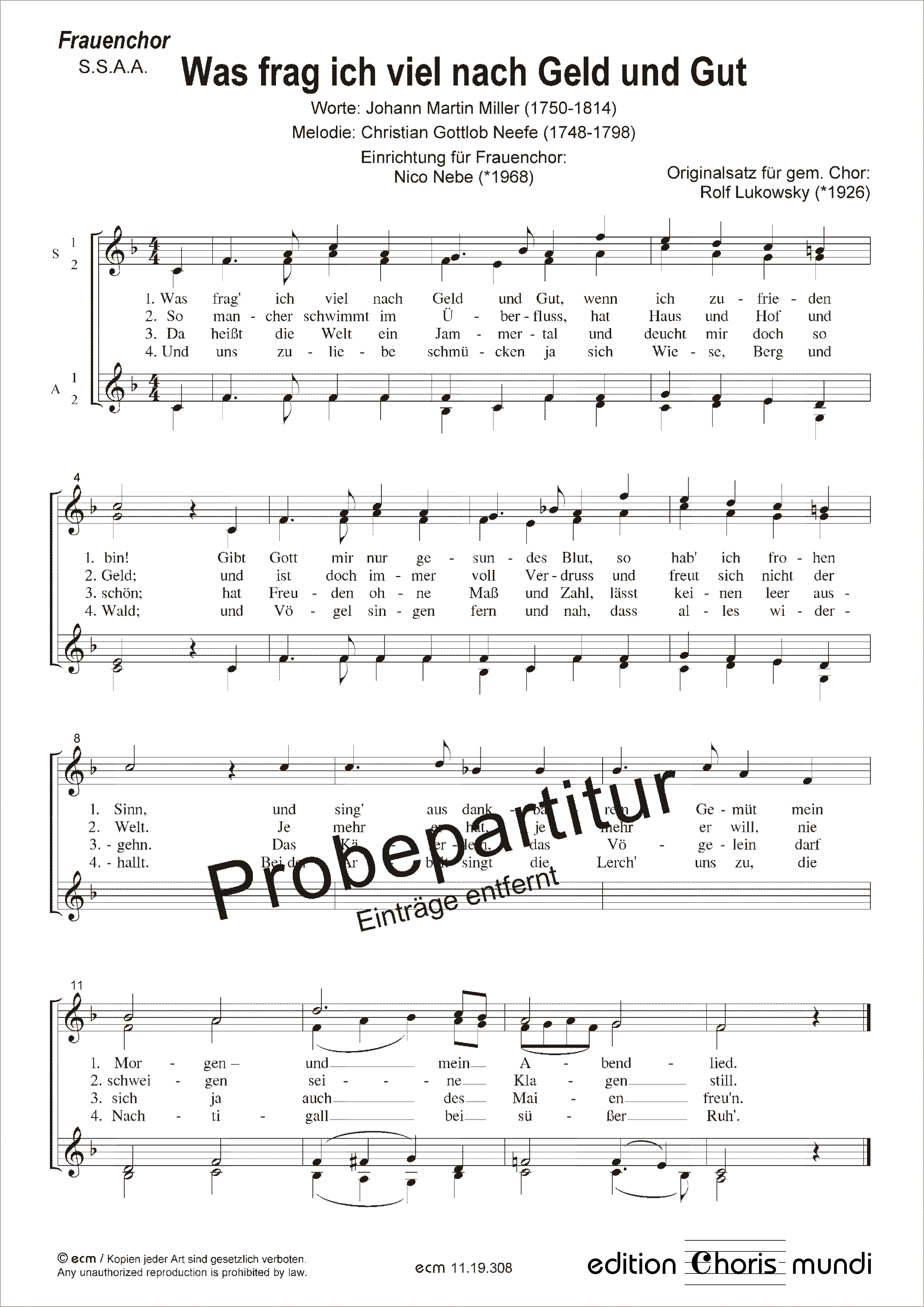 Melodie: Christian Gottlob Neefe (1748-1798) Dieser Satz ist auch in den Fassungen für Gemischten Chor und Männerchor erhältlich. Besetzung: S.S.A.A. / Text: August Disselhoff (1829-1903) Sprache: deutsch / Tonart: F-Dur / Dauer: 2:30 Min.