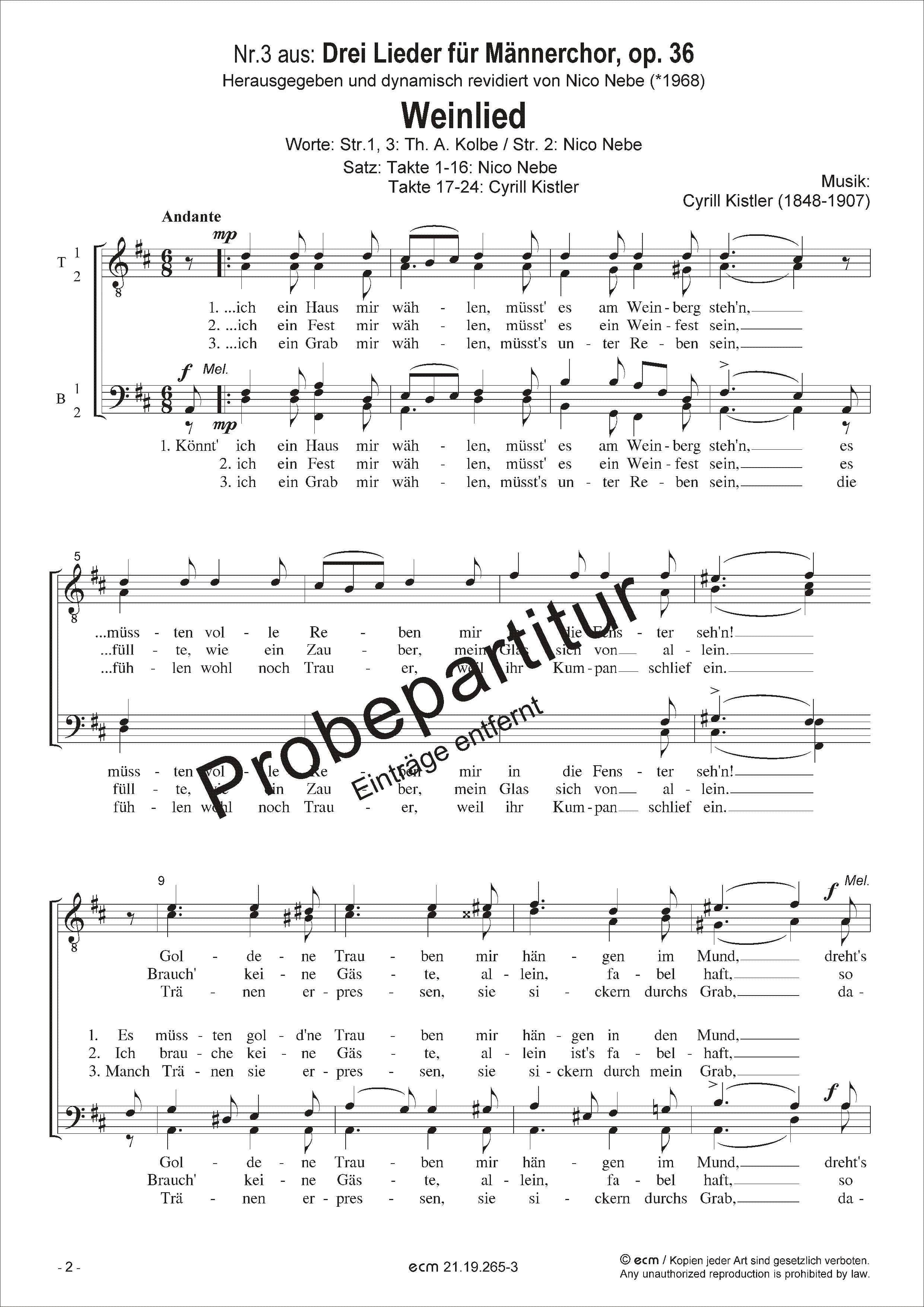 Nr.1 aus: Drei Lieder für Männerchor, op. 36 1. Ade, du lieber Tannenwald / 2. Auf die Berge / 3. Weinlied Besetzung: T.T.B.B. Text: Worte: Str.1, 3: Th. A. Kolbe / Str. 2: Nico Nebe (*1968) Sprache: deutsch / Tonart: D-Dur / Dauer: 2:30 Min.