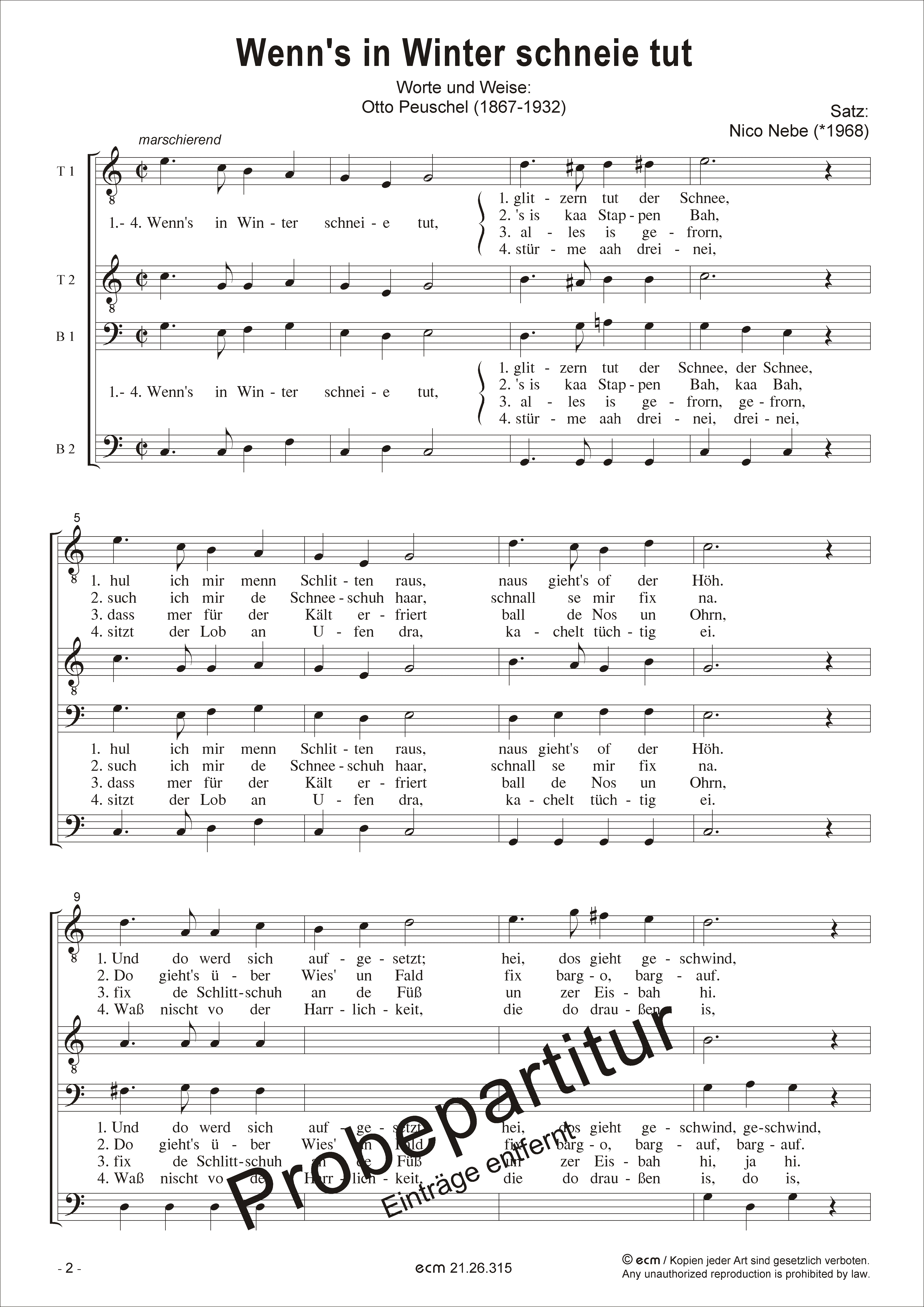 Melodie: Otto Peuschel (1867-1932) Besetzung: T.T.B.B. / Text: (erzgebirgische Mundart) Otto Peuschel (1867-1932) Sprache: deutsch / Tonart: C-Dur / Dauer: 3:00 Min. Dieses Werk ist folgenden Text- und Besetzungsvarianten erhältlich: In erzgebirgischer Mundart: Gemischter Chor S.S.A.Bar. • Männerchor T.T.B.B. • Frauenchor S.S.A.A. In einer hochdeutschen Textfassung: Gemischter Chor S.S.A.Bar. • Männerchor T.T.B.B. • Frauenchor S.S.A.A.