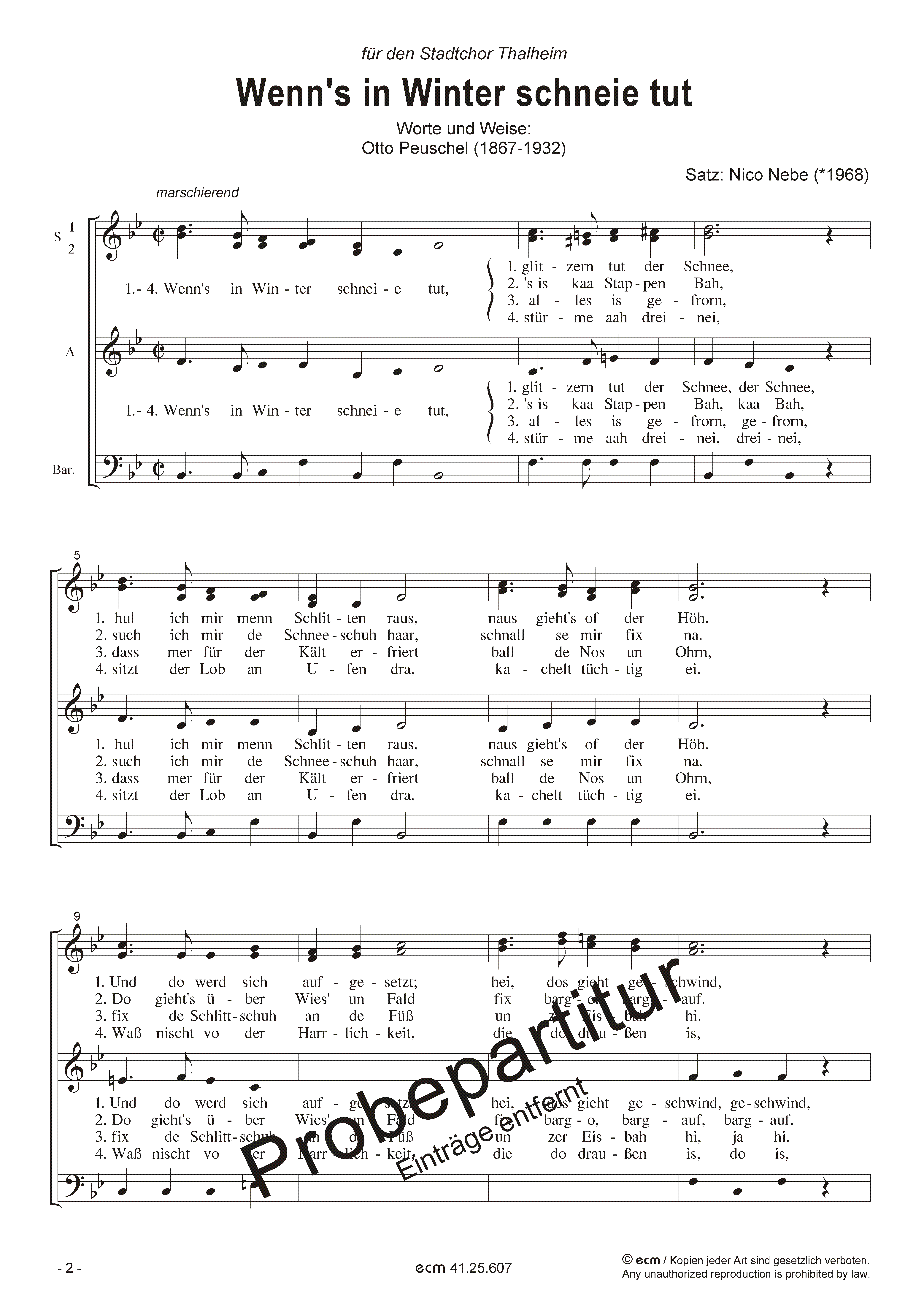 Melodie: Otto Peuschel (1867-1932) Besetzung: S.S.A.Bar. / Text: (erzgebirgische Mundart) Otto Peuschel (1867-1932) Sprache: deutsch / Tonart: B-Dur / Dauer: 3:00 Min. Dieses Stück ist auch in einer hochdeutschen Textfassung erhältlich.