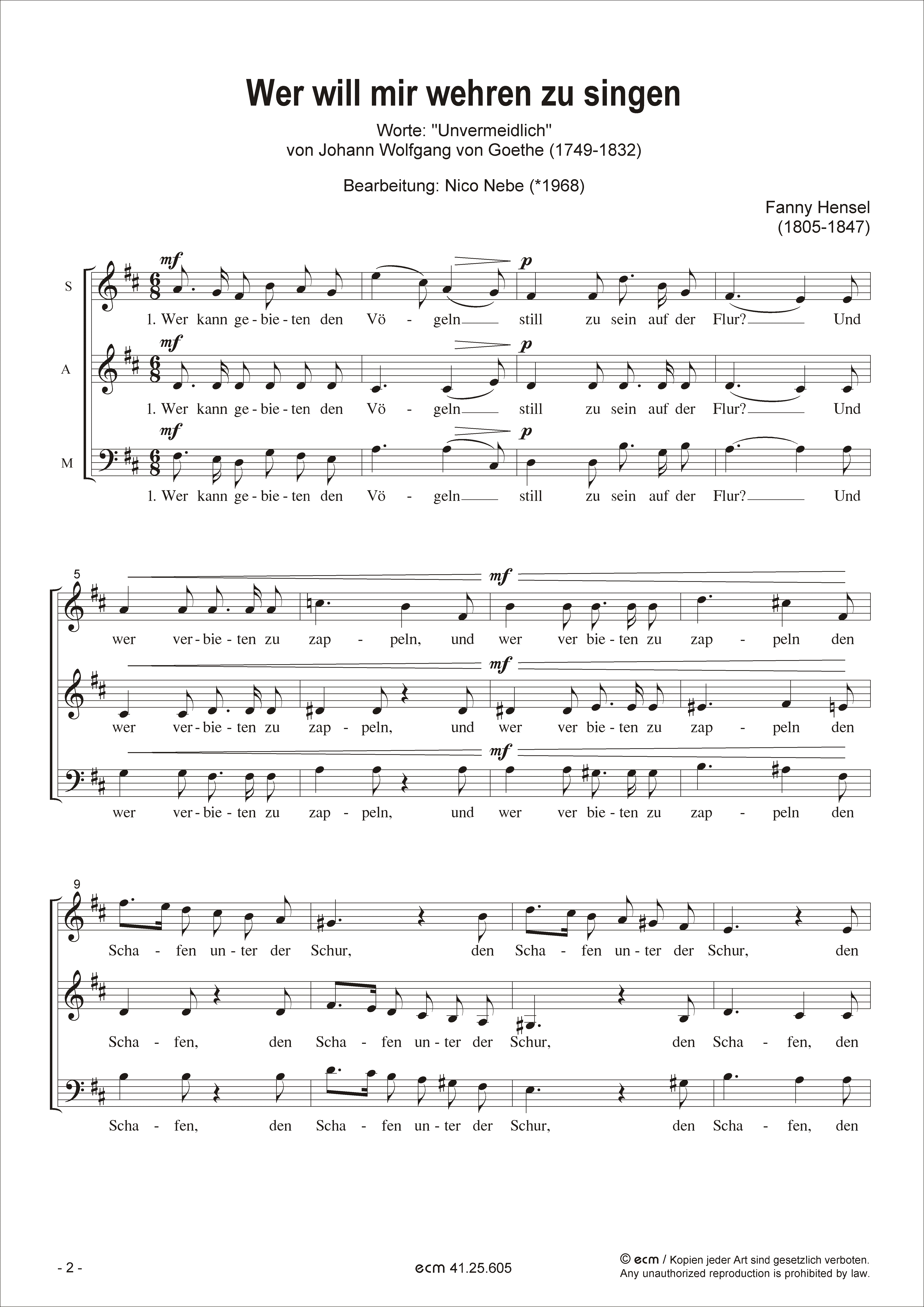 Besetzung: S.A.M. / Text: Johann Wolfgang v. Goethe (1749-1832) Sprache: deutsch / Tonart: D-Dur / Dauer: 3:00 Min. Dieses Werk ist auch in den Fassungen für Frauenchor und Männerchor erhältlich.