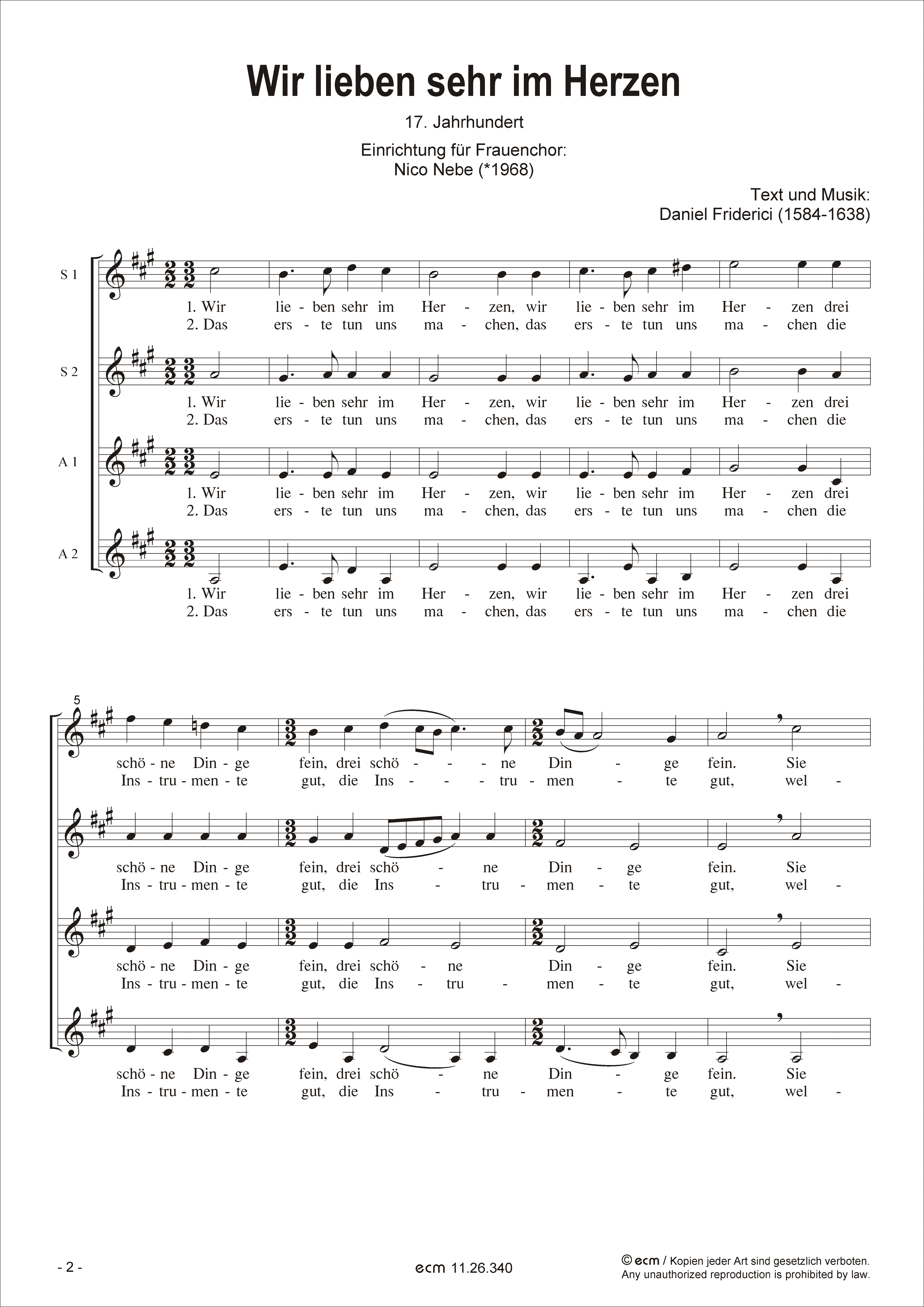 Besetzung: S.S.A.A. / Text: Daniel Friderici (1584-1638) Sprache: deutsch / Tonart: A-Dur / Dauer: 2:00 Min. Dieser Satz ist auch in den Fassungen für Gemischten Chor und Männerchor verfügbar.