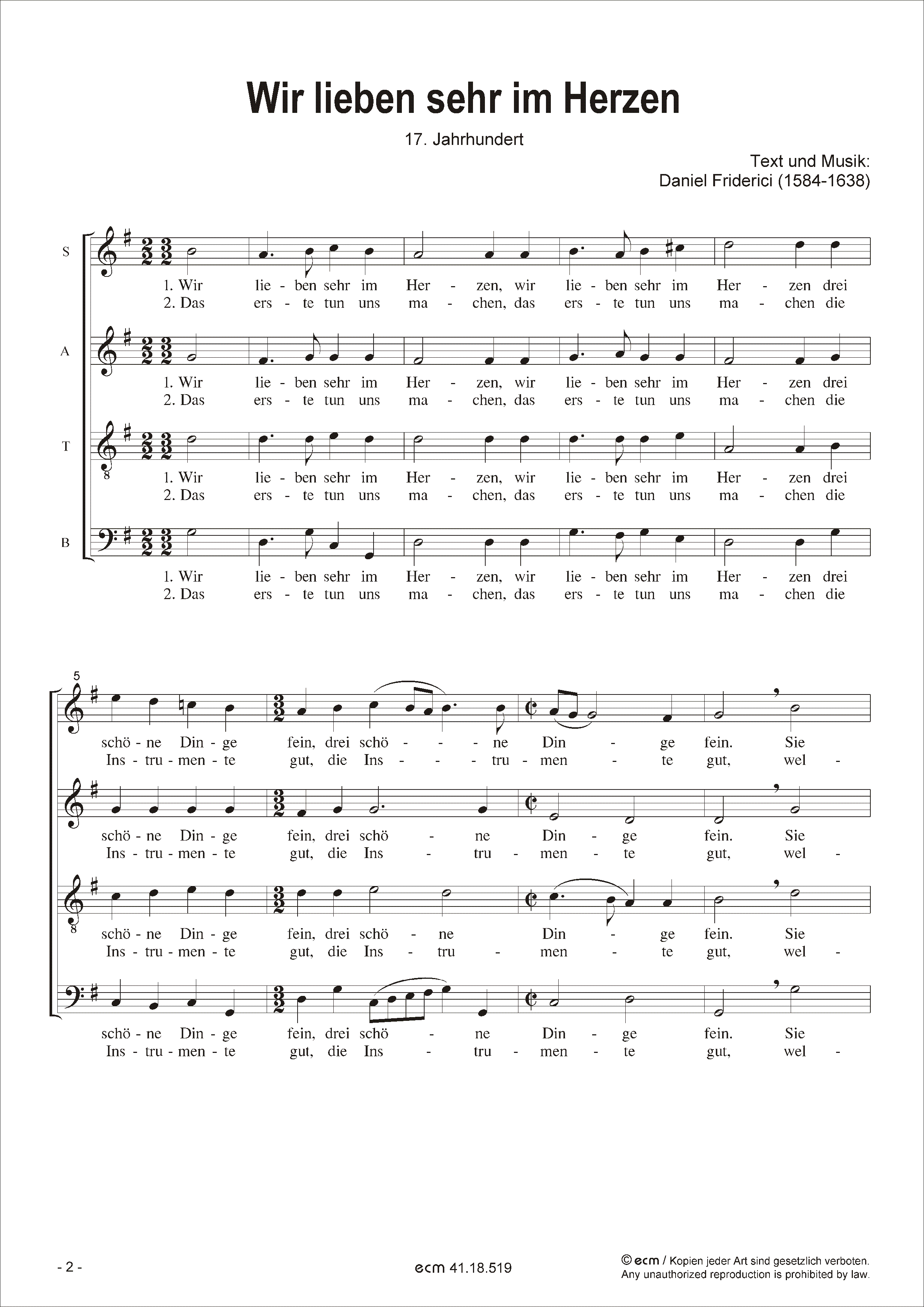 Dieser Satz ist auch in einer Fassung für Männerchor verfügbar. Besetzung: S.A.T.B. / Text: Daniel Friderici (1584-1638) Sprache: deutsch / Tonart: G-Dur / Dauer: 2:00 Min.